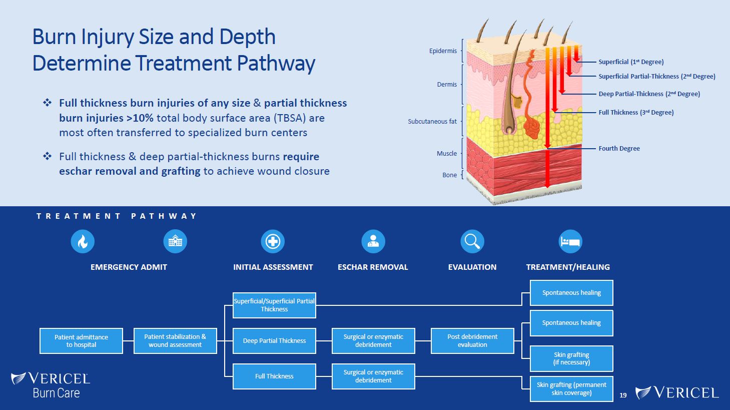 Patient admittance to hospital  Patient stabilization & wound assessment  Superficial/Superficial Partial Thickness  Spontaneous healing  Deep Partial Thickness  Surgical or enzymatic debridement  Post debridement evaluation  Spontaneous healing  Skin grafting (if necessary)  Full Thickness  Surgical or enzymatic debridement  Skin grafting (permanent skin coverage)  19  Burn Injury Size and Depth Determine Treatment Pathway  Full thickness burn injuries of any size & partial thickness burn injuries >10% total body surface area (TBSA) are most often transferred to specialized burn centers  Full thickness & deep partial-thickness burns require  eschar removal and grafting to achieve wound closure  EMERGENCY ADMIT  INITIAL ASSESSMENT  ESCHAR REMOVAL  EVALUATION  TREATMENT/HEALING  T R E A T M E N T  P A T H W A Y  Epidermis  Dermis  Subcutaneous fat  Muscle  Bone  Superficial (1st Degree)  Superficial Partial-Thickness (2nd Degree)  Deep Partial-Thickness (2nd Degree)  Full Thickness (3rd Degree)  Fourth Degree