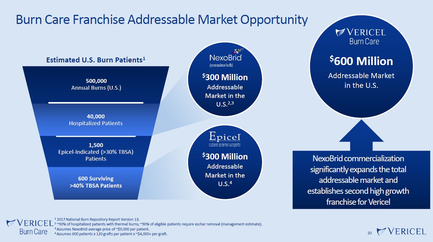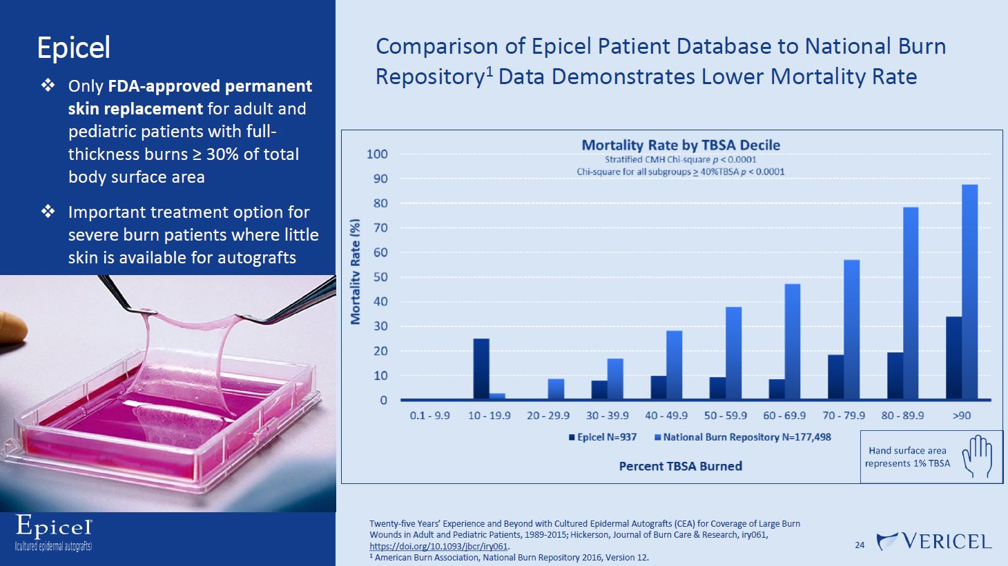 Epicel  24  Comparison of Epicel Patient Database to National Burn Repository1 Data Demonstrates Lower Mortality Rate  Twenty-five Years’ Experience and Beyond with Cultured Epidermal Autografts (CEA) for Coverage of Large Burn Wounds in Adult and Pediatric Patients, 1989-2015; Hickerson, Journal of Burn Care & Research, iry061, https://doi.org/10.1093/jbcr/iry061.  1 American Burn Association, National Burn Repository 2016, Version 12.  Only FDA-approved permanent skin replacement for adult and pediatric patients with full-  thickness burns ≥ 30% of total  body surface area  Important treatment option for severe burn patients where little skin is available for autografts