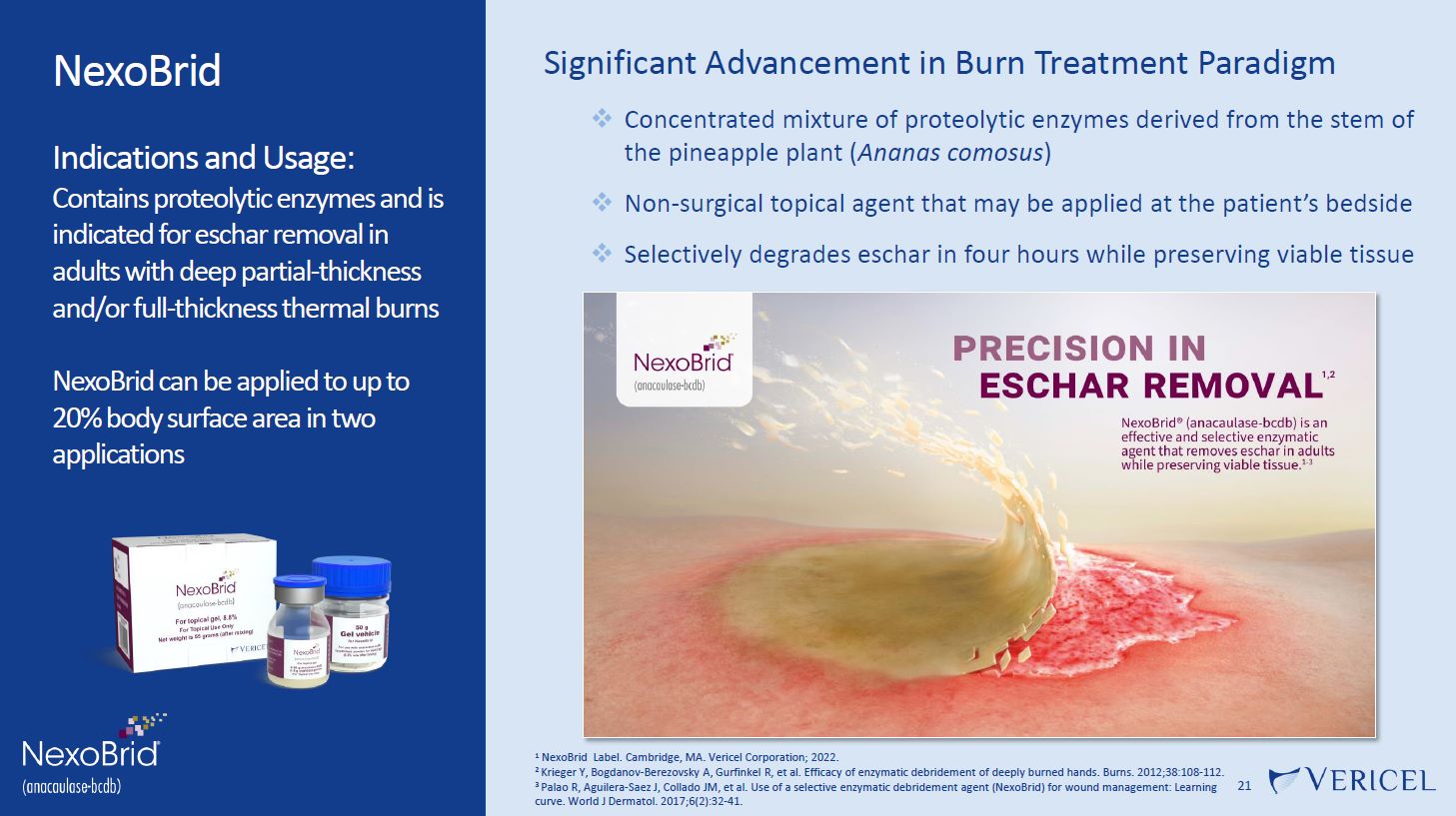 NexoBrid  Indications and Usage: Contains proteolytic enzymes and is indicated for eschar removal in adults with deep partial-thickness and/or full-thickness thermal burns  NexoBrid can be applied to up to 20% body surface area in two applications  Significant Advancement in Burn Treatment Paradigm  Concentrated mixture of proteolytic enzymes derived from the stem of the pineapple plant (Ananas comosus)  Non-surgical topical agent that may be applied at the patient’s bedside  Selectively degrades eschar in four hours while preserving viable tissue  1 NexoBrid Label. Cambridge, MA. Vericel Corporation; 2022.  2 Krieger Y, Bogdanov-Berezovsky A, Gurfinkel R, et al. Efficacy of enzymatic debridement of deeply burned hands. Burns. 2012;38:108-112.  3 Palao R, Aguilera-Saez J, Collado JM, et al. Use of a selective enzymatic debridement agent (NexoBrid) for wound management: Learning 21  curve. World J Dermatol. 2017;6(2):32-41.