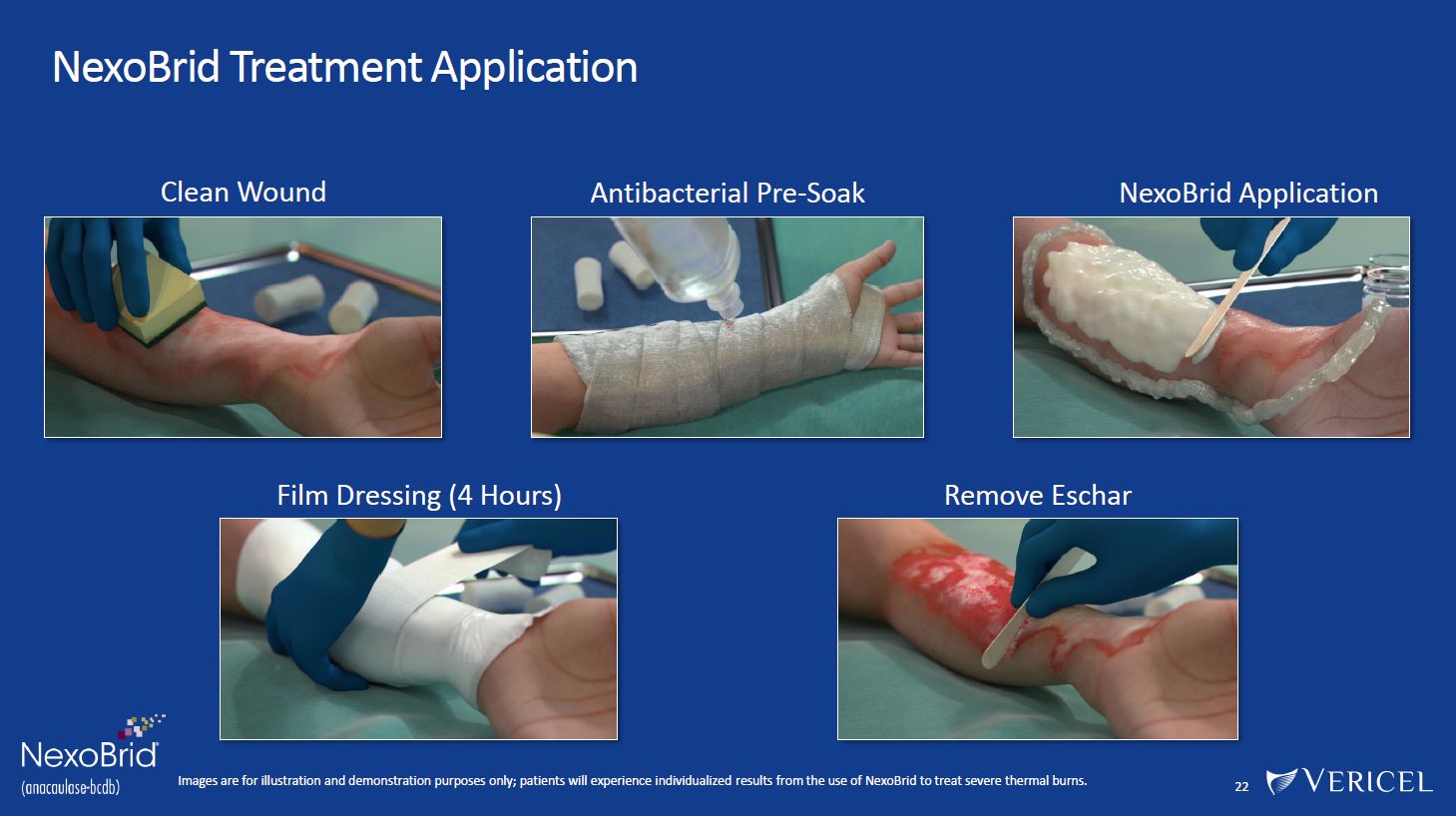 NexoBrid Treatment Application  22  Clean Wound  Antibacterial Pre-Soak  NexoBrid Application  Film Dressing (4 Hours)  Remove Eschar  Images are for illustration and demonstration purposes only; patients will experience individualized results from the use of NexoBrid to treat severe thermal burns.