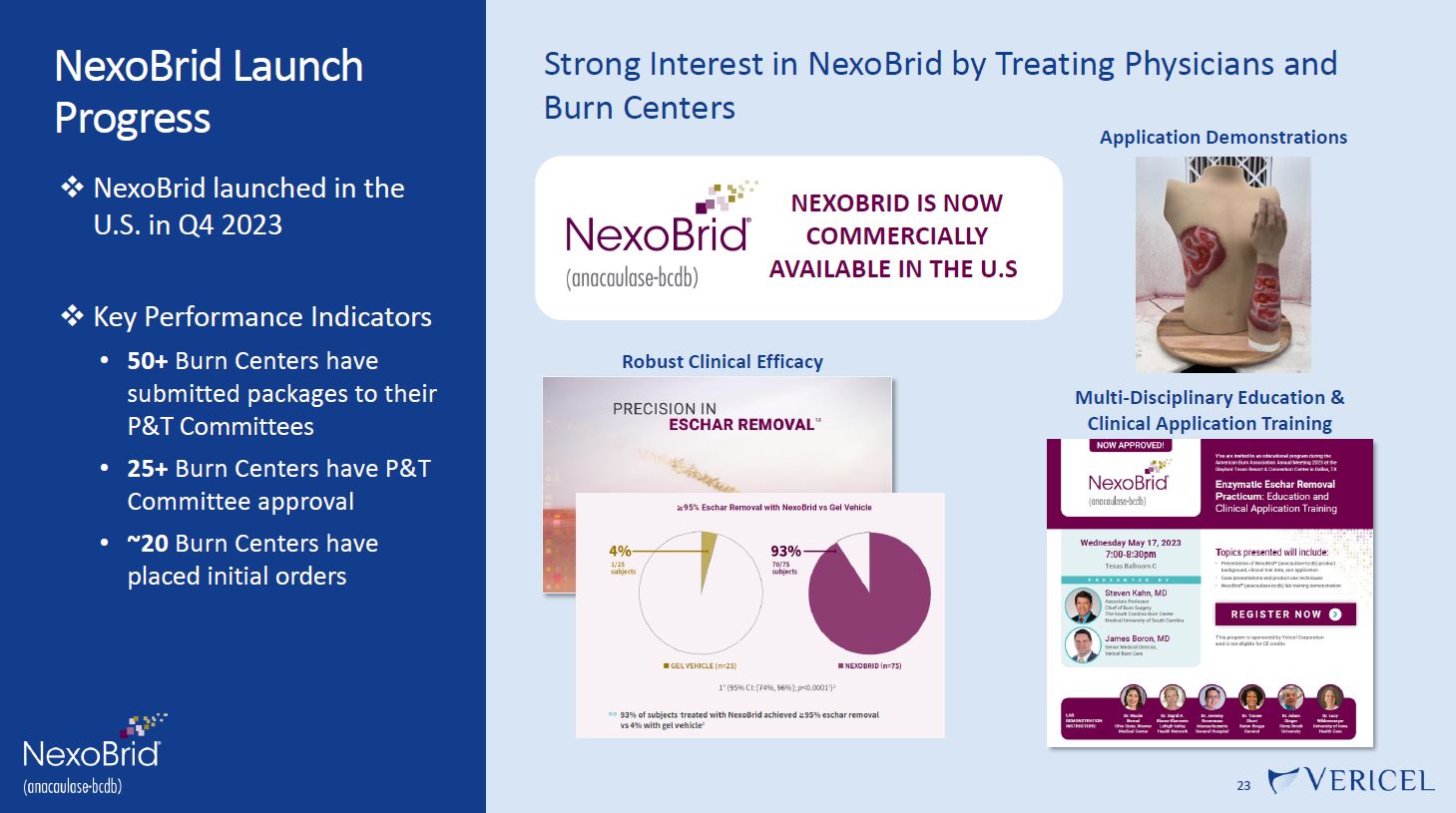 NexoBrid Launch Progress  23  NexoBrid launched in the  U.S. in Q4 2023  Key Performance Indicators  50+ Burn Centers have submitted packages to their P&T Committees  25+ Burn Centers have P&T Committee approval  ~20 Burn Centers have  placed initial orders  Robust Clinical Efficacy  Strong Interest in NexoBrid by Treating Physicians and Burn Centers  Application Demonstrations  Multi-Disciplinary Education & Clinical Application Training  NEXOBRID IS NOW COMMERCIALLY AVAILABLE IN THE U.S