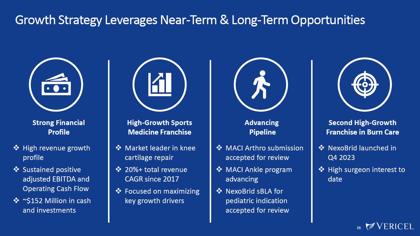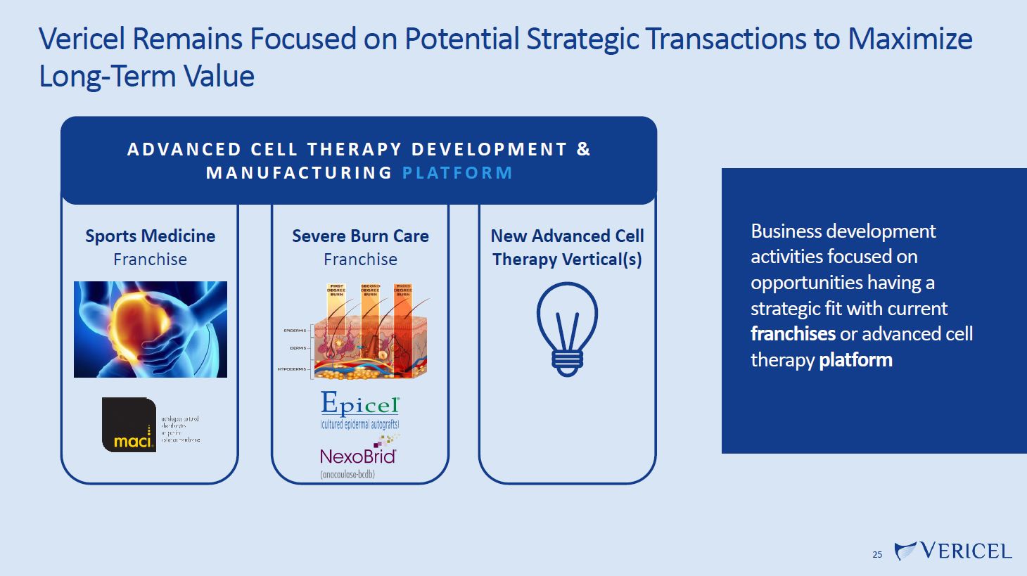 Vericel Remains Focused on Potential Strategic Transactions to Maximize Long-Term Value  Business development activities focused on opportunities having a strategic fit with current franchises or advanced cell therapy platform  25  Sports Medicine  Franchise  Severe Burn Care  Franchise  A D VA N C E D C E L L T H E R A P Y D E V E L O P M E N T &  M A N U FA C T U R I N G P L AT F O R M  New Advanced Cell  Therapy Vertical(s)