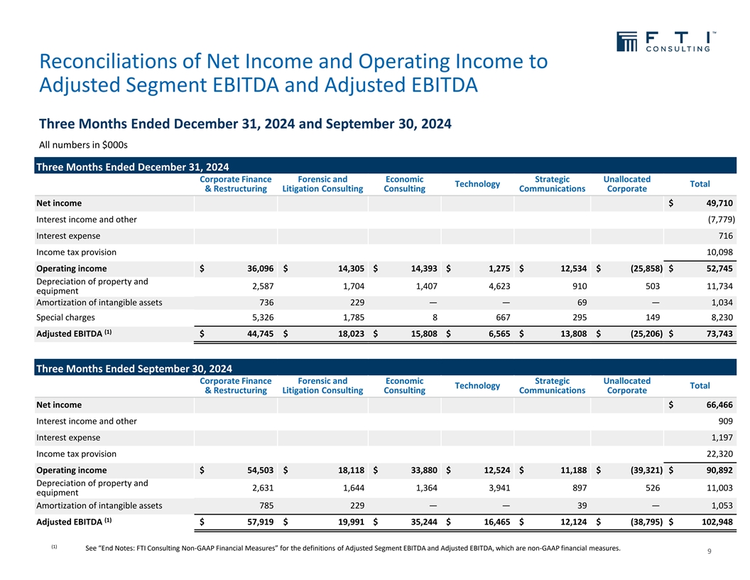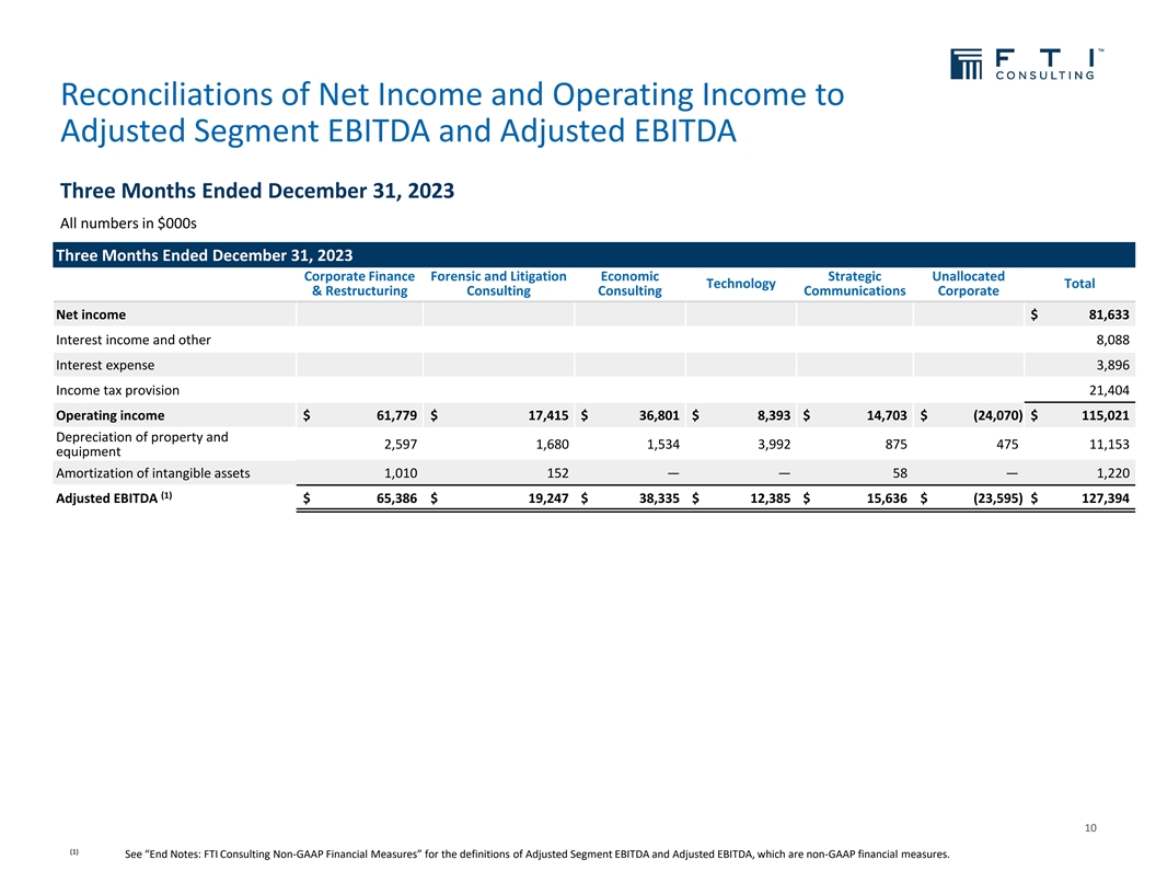 Reconciliations of Net Income and Operating Income to Adjusted Segment EBITDA and Adjusted EBITDA Three Months Ended December 31, 2024 and September 30, 2024 All numbers in $000s Three Months Ended December 31, 2024 Corporate Finance Forensic and Economic Strategic Unallocated Technology Total & Restructuring Litigation Consulting Consulting Communications Corporate Net income $ 49,710 Interest income and other (7,779) Interest expense 716 Income tax provision 10,098 Operating income $ 36,096 $ 14,305 $ 14,393 $ 1,275 $ 12,534 $ (25,858) $ 52,745 Depreciation of property and 2,587 1,704 1,407 4,623 910 503 11,734 equipment Amortization of intangible assets 736 229 — — 69 — 1,034 Special charges 5,326 1,785 8 667 295 149 8,230 (1) Adjusted EBITDA $ 44,745 $ 18,023 $ 15,808 $ 6,565 $ 13,808 $ (25,206) $ 73,743 Three Months Ended September 30, 2024 Corporate Finance Forensic and Economic Strategic Unallocated Technology Total & Restructuring Litigation Consulting Consulting Communications Corporate Net income $ 66,466 Interest income and other 909 Interest expense 1,197 Income tax provision 22,320 Operating income $ 54,503 $ 18,118 $ 33,880 $ 12,524 $ 11,188 $ (39,321) $ 90,892 Depreciation of property and 2,631 1,644 1,364 3,941 897 526 11,003 equipment Amortization of intangible assets 785 229 — — 39 — 1,053 (1) Adjusted EBITDA $ 57,919 $ 19,991 $ 35,244 $ 16,465 $ 12,124 $ (38,795) $ 102,948 (1) See “End Notes: FTI Consulting Non-GAAP Financial Measures” for the definitions of Adjusted Segment EBITDA and Adjusted EBITDA, which are non-GAAP financial measures. 9