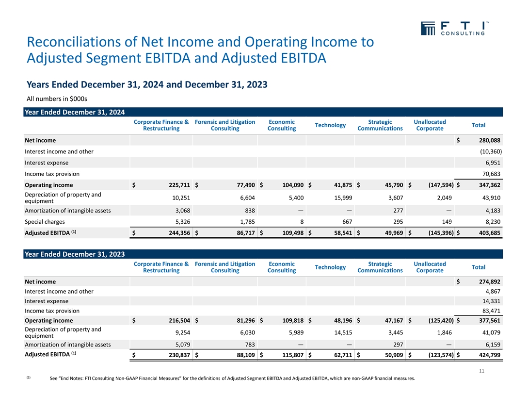 Reconciliations of Net Income and Operating Income to Adjusted Segment EBITDA and Adjusted EBITDA Three Months Ended December 31, 2023 All numbers in $000s Three Months Ended December 31, 2023 Corporate Finance Forensic and Litigation Economic Strategic Unallocated Technology Total & Restructuring Consulting Consulting Communications Corporate Net income $ 81,633 Interest income and other 8,088 Interest expense 3,896 Income tax provision 21,404 Operating income $ 61,779 $ 17,415 $ 36,801 $ 8,393 $ 14,703 $ (24,070) $ 115,021 Depreciation of property and 2,597 1,680 1,534 3,992 875 475 11,153 equipment Amortization of intangible assets 1,010 152 — — 58 — 1,220 (1) Adjusted EBITDA $ 65,386 $ 19,247 $ 38,335 $ 12,385 $ 15,636 $ (23,595) $ 127,394 10 (1) See “End Notes: FTI Consulting Non-GAAP Financial Measures” for the definitions of Adjusted Segment EBITDA and Adjusted EBITDA, which are non-GAAP financial measures.
