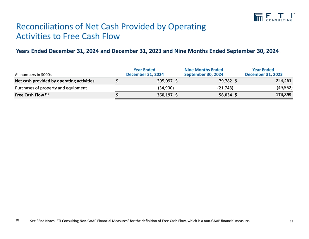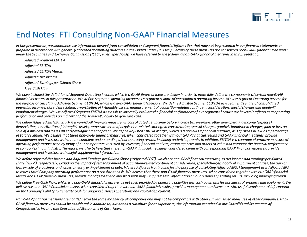 Reconciliations of Net Cash Provided by Operating Activities to Free Cash Flow Years Ended December 31, 2024 and December 31, 2023 and Nine Months Ended September 30, 2024 Year Ended Nine Months Ended Year Ended December 31, 2024 September 30, 2024 December 31, 2023 All numbers in $000s $ 224,461 Net cash provided by operating activities $ 395,097 $ 79,782 (49,562) Purchases of property and equipment (34,900) (21,748) (1) $ 174,899 Free Cash Flow $ 360,197 $ 58,034 (1) See “End Notes: FTI Consulting Non-GAAP Financial Measures” for the definition of Free Cash Flow, which is a non-GAAP financial measure. 12
