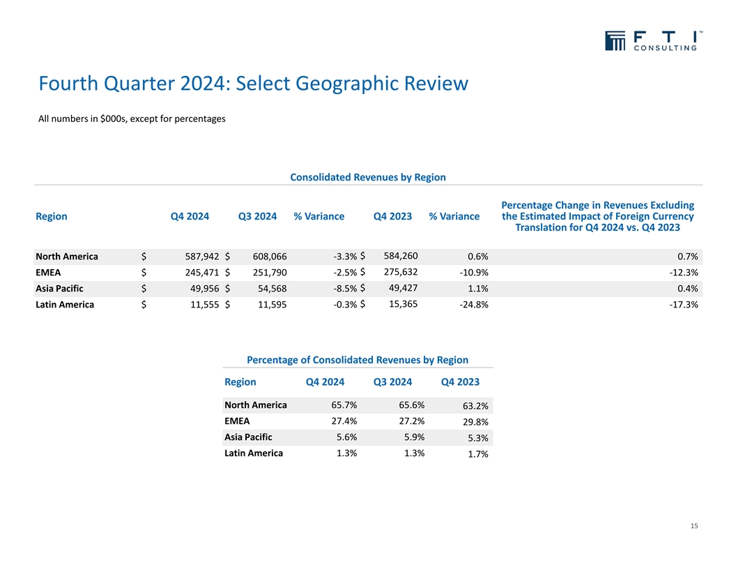 Fourth Quarter 2024: Select Geographic Review All numbers in $000s, except for percentages Consolidated Revenues by Region Percentage Change in Revenues Excluding the Estimated Impact of Foreign Currency Region Q4 2024 Q3 2024 % Variance Q4 2023 % Variance Translation for Q4 2024 vs. Q4 2023 North America $ 587,942 $ 608,066 -3.3% $ 584,260 0.6% 0.7% $ 275,632 EMEA $ 245,471 $ 251,790 -2.5% -10.9% -12.3% $ 49,427 Asia Pacific $ 49,956 $ 54,568 -8.5% 1.1% 0.4% $ 15,365 Latin America $ 11,555 $ 11,595 -0.3% -24.8% -17.3% Percentage of Consolidated Revenues by Region Region Q4 2024 Q3 2024 Q4 2023 North America 65.7% 65.6% 63.2% EMEA 27.4% 27.2% 29.8% Asia Pacific 5.6% 5.9% 5.3% Latin America 1.3% 1.3% 1.7% 15