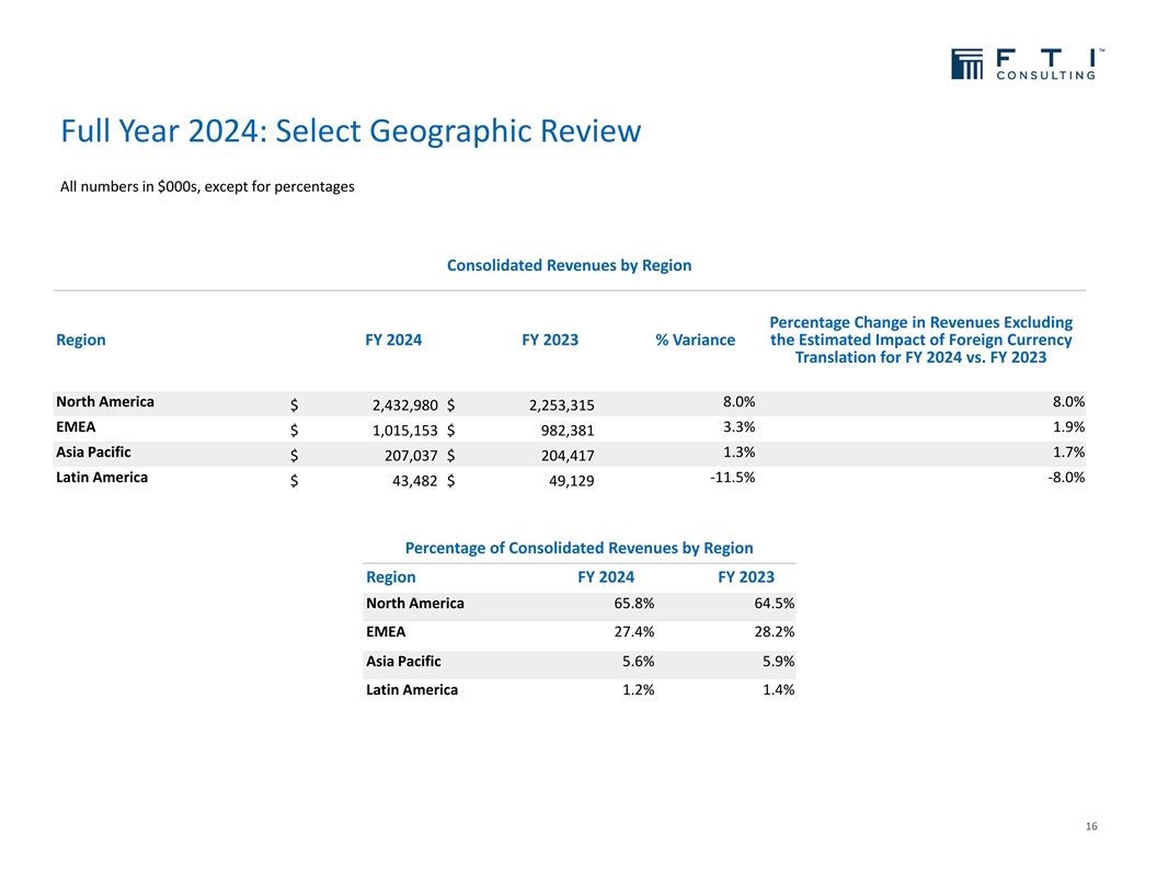 Full Year 2024: Select Geographic Review All numbers in $000s, except for percentages Consolidated Revenues by Region Percentage Change in Revenues Excluding the Estimated Impact of Foreign Currency Region FY 2024 FY 2023 % Variance Translation for FY 2024 vs. FY 2023 North America 8.0% 8.0% $ 2,432,980 $ 2,253,315 EMEA 3.3% 1.9% $ 1,015,153 $ 982,381 Asia Pacific 1.3% 1.7% $ 207,037 $ 204,417 Latin America -11.5% -8.0% $ 43,482 $ 49,129 Percentage of Consolidated Revenues by Region Region FY 2024 FY 2023 North America 65.8% 64.5% EMEA 27.4% 28.2% Asia Pacific 5.6% 5.9% Latin America 1.2% 1.4% 16