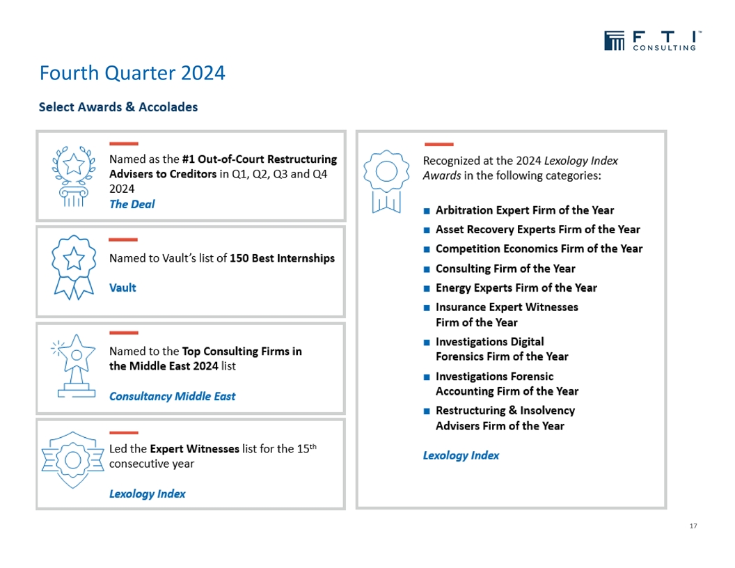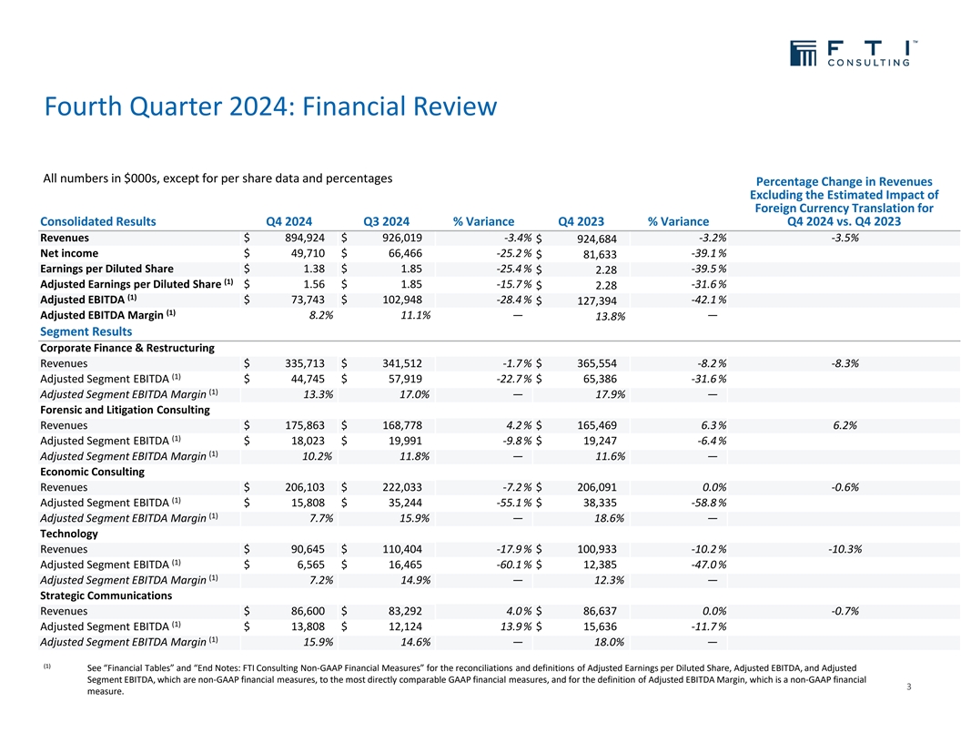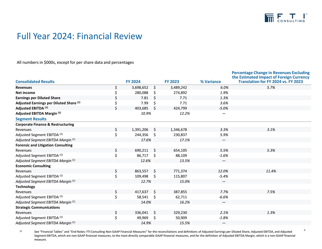 Fourth Quarter 2024: Financial Review All numbers in $000s, except for per share data and percentages Percentage Change in Revenues Excluding the Estimated Impact of Foreign Currency Translation for Consolidated Results Q4 2024 Q3 2024 % Variance Q4 2023 % Variance Q4 2024 vs. Q4 2023 Revenues $ 894,924 $ 926,019 -3.4% -3.2% -3.5% $ 924,684 Net income $ 49,710 $ 66,466 -25.2 % -39.1 % $ 81,633 Earnings per Diluted Share $ 1.38 $ 1.85 -25.4 % -39.5 % $ 2.28 (1) Adjusted Earnings per Diluted Share $ 1.56 $ 1.85 -15.7 % -31.6 % $ 2.28 (1) Adjusted EBITDA $ 73,743 $ 102,948 -28.4 % -42.1 % $ 127,394 (1) Adjusted EBITDA Margin 8.2% 11.1% — — 13.8% Segment Results Corporate Finance & Restructuring Revenues $ 335,713 $ 341,512 -1.7 % $ 365,554 -8.2 % -8.3% (1) Adjusted Segment EBITDA $ 44,745 $ 57,919 -22.7 % $ 65,386 -31.6 % (1) Adjusted Segment EBITDA Margin 13.3% 17.0% — 17.9% — Forensic and Litigation Consulting Revenues $ 175,863 $ 168,778 4.2 % $ 165,469 6.3 % 6.2% (1) Adjusted Segment EBITDA $ 18,023 $ 19,991 -9.8 % $ 19,247 -6.4 % (1) Adjusted Segment EBITDA Margin 10.2% 11.8% — 11.6% — Economic Consulting Revenues $ 206,103 $ 222,033 -7.2 % $ 206,091 0.0% -0.6% (1) Adjusted Segment EBITDA $ 15,808 $ 35,244 -55.1 % $ 38,335 -58.8 % (1) Adjusted Segment EBITDA Margin 7.7% 15.9% — 18.6% — Technology Revenues $ 90,645 $ 110,404 -17.9 % $ 100,933 -10.2 % -10.3% (1) Adjusted Segment EBITDA $ 6,565 $ 16,465 -60.1 % $ 12,385 -47.0 % (1) Adjusted Segment EBITDA Margin 7.2% 14.9% — 12.3% — Strategic Communications Revenues $ 86,600 $ 83,292 4.0 % $ 86,637 0.0% -0.7% (1) Adjusted Segment EBITDA $ 13,808 $ 12,124 13.9 % $ 15,636 -11.7 % (1) Adjusted Segment EBITDA Margin 15.9% 14.6% — 18.0% — (1) See “Financial Tables” and “End Notes: FTI Consulting Non-GAAP Financial Measures” for the reconciliations and definitions of Adjusted Earnings per Diluted Share, Adjusted EBITDA, and Adjusted Segment EBITDA, which are non-GAAP financial measures, to the most directly comparable GAAP financial measures, and for the definition of Adjusted EBITDA Margin, which is a non-GAAP financial 3 measure.