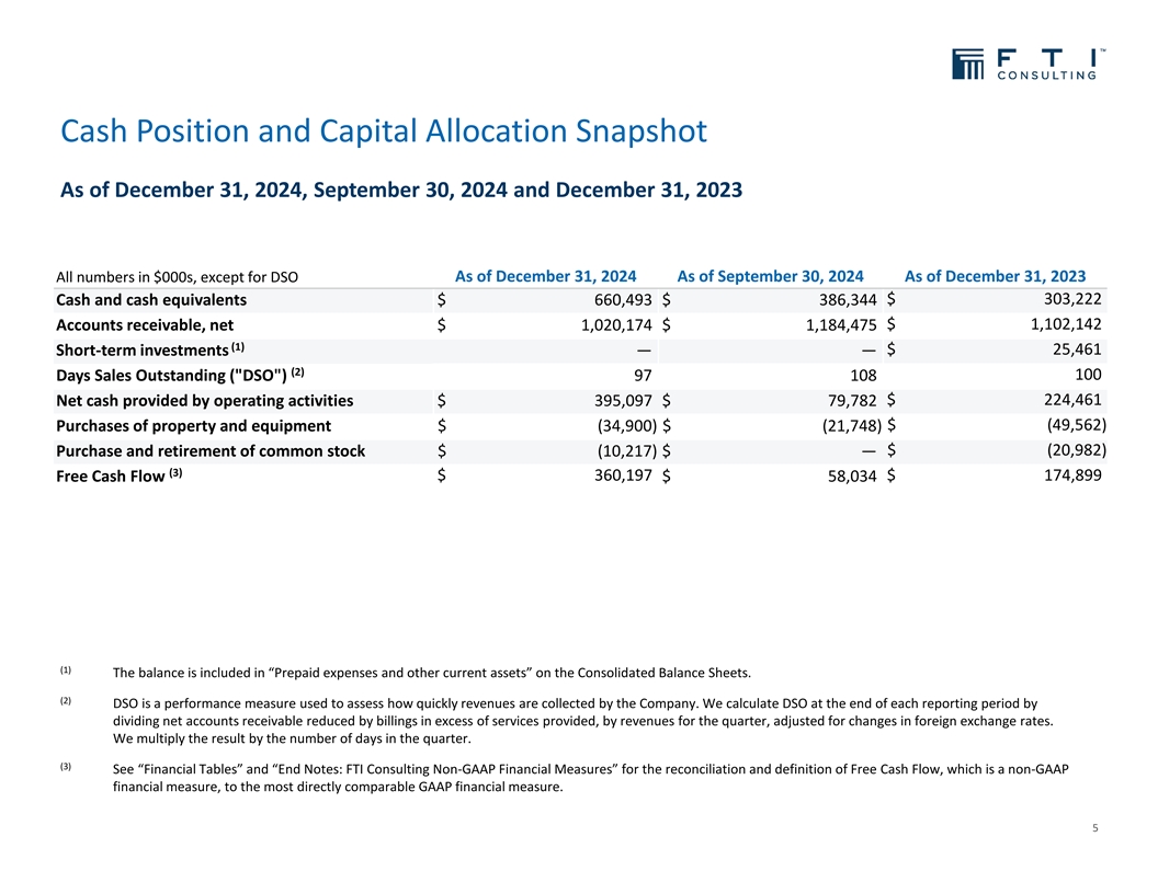 Full Year 2024: Financial Review All numbers in $000s, except for per share data and percentages Percentage Change in Revenues Excluding the Estimated Impact of Foreign Currency Consolidated Results FY 2024 FY 2023 % Variance Translation for FY 2024 vs. FY 2023 Revenues $ 3,698,652 $ 3,489,242 6.0% 5.7% Net income $ 280,088 $ 274,892 1.9% Earnings per Diluted Share $ 7.81 $ 7.71 1.3% (1) Adjusted Earnings per Diluted Share $ 7.99 $ 7.71 3.6% (1) Adjusted EBITDA $ 403,685 $ 424,799 -5.0% (1) Adjusted EBITDA Margin 10.9% 12.2% — Segment Results Corporate Finance & Restructuring Revenues $ 1,391,206 $ 1,346,678 3.3% 3.1% (1) Adjusted Segment EBITDA $ 244,356 $ 230,837 5.9% (1) Adjusted Segment EBITDA Margin 17.6% 17.1% — Forensic and Litigation Consulting Revenues $ 690,211 $ 654,105 5.5% 5.3% (1) Adjusted Segment EBITDA $ 86,717 $ 88,109 -1.6% (1) Adjusted Segment EBITDA Margin 12.6% 13.5% — Economic Consulting Revenues $ 863,557 $ 771,374 12.0% 11.4% (1) Adjusted Segment EBITDA $ 109,498 $ 115,807 -5.4% (1) Adjusted Segment EBITDA Margin 12.7% 15.0% — Technology Revenues $ 417,637 $ 387,855 7.7% 7.5% (1) Adjusted Segment EBITDA $ 58,541 $ 62,711 -6.6% (1) Adjusted Segment EBITDA Margin 14.0% 16.2% — Strategic Communications Revenues $ 336,041 $ 329,230 2.1% 1.3% (1) Adjusted Segment EBITDA $ 49,969 $ 50,909 -1.8% (1) Adjusted Segment EBITDA Margin 14.9% 15.5% — 4 (1) See “Financial Tables” and “End Notes: FTI Consulting Non-GAAP Financial Measures” for the reconciliations and definitions of Adjusted Earnings per Diluted Share, Adjusted EBITDA, and Adjusted Segment EBITDA, which are non-GAAP financial measures, to the most directly comparable GAAP financial measures, and for the definition of Adjusted EBITDA Margin, which is a non-GAAP financial measure.