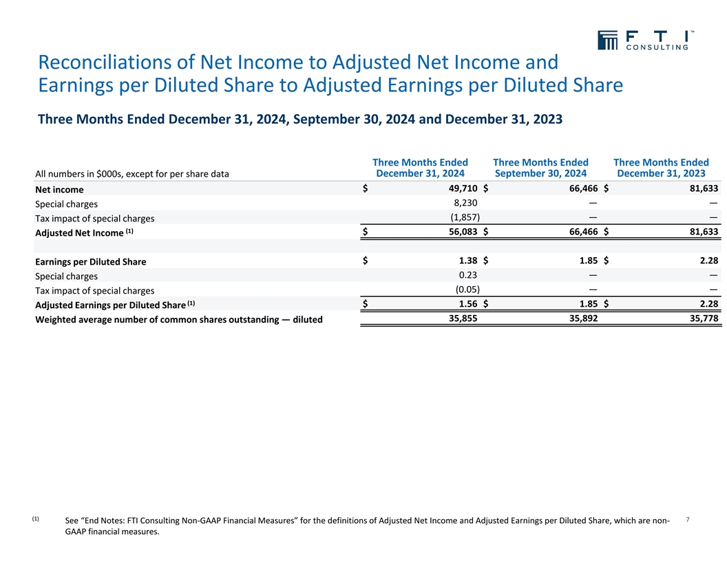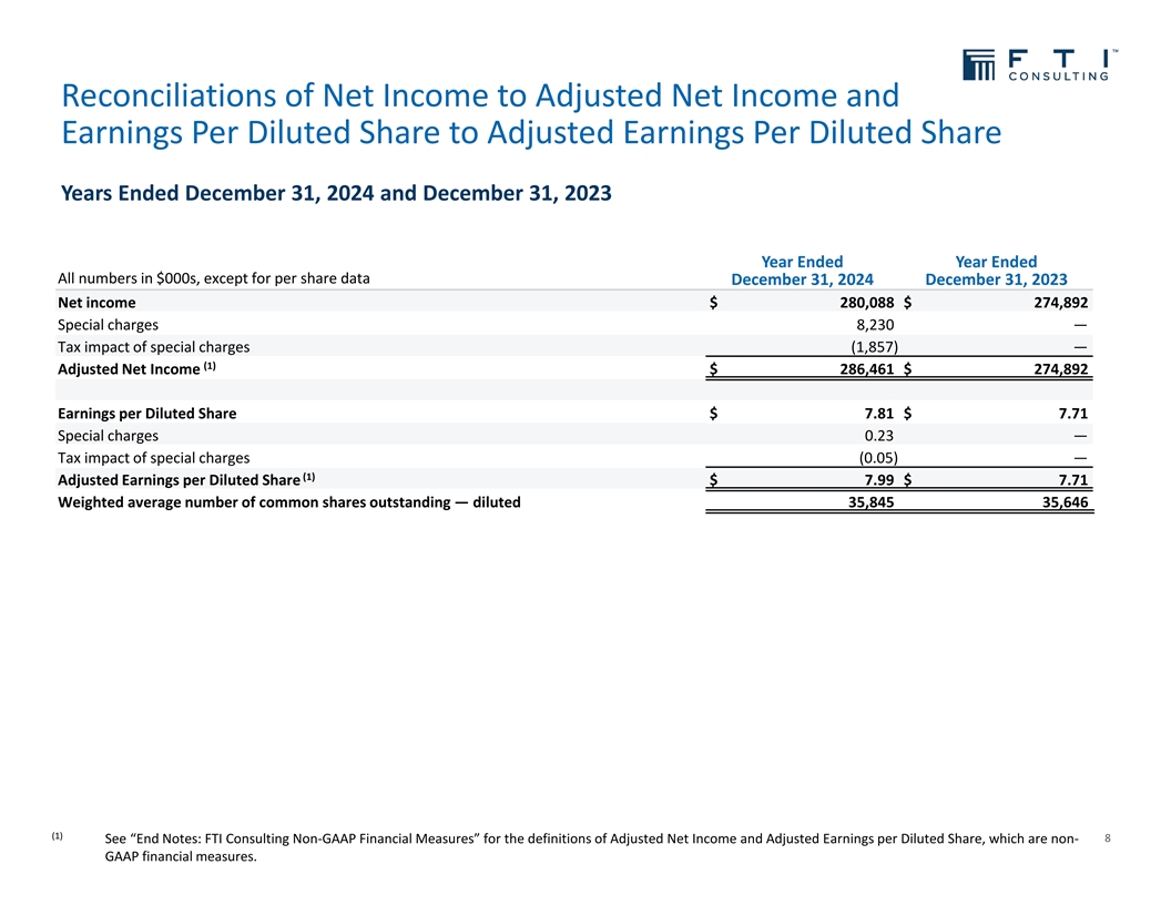 Reconciliations of Net Income to Adjusted Net Income and Earnings per Diluted Share to Adjusted Earnings per Diluted Share Three Months Ended December 31, 2024, September 30, 2024 and December 31, 2023 Three Months Ended Three Months Ended Three Months Ended All numbers in $000s, except for per share data December 31, 2024 September 30, 2024 December 31, 2023 $ 49,710 $ 66,466 $ 81,633 Net income 8,230 — — Special charges (1,857) — — Tax impact of special charges (1) $ 56,083 $ 66,466 $ 81,633 Adjusted Net Income $ 1.38 $ 1.85 $ 2.28 Earnings per Diluted Share 0.23 — — Special charges (0.05) — — Tax impact of special charges (1) $ 1.56 $ 1.85 $ 2.28 Adjusted Earnings per Diluted Share 35,855 35,892 35,778 Weighted average number of common shares outstanding — diluted (1) 7 See “End Notes: FTI Consulting Non-GAAP Financial Measures” for the definitions of Adjusted Net Income and Adjusted Earnings per Diluted Share, which are non- GAAP financial measures.