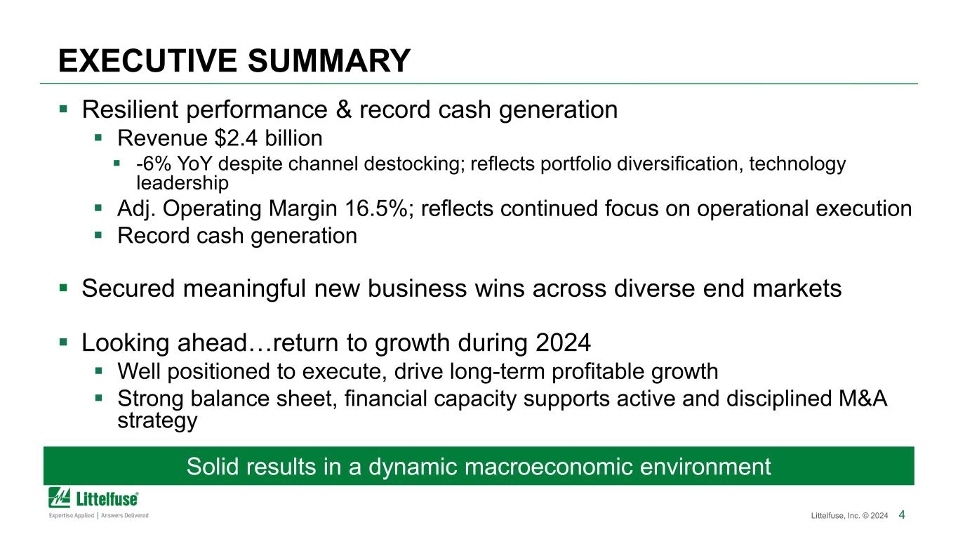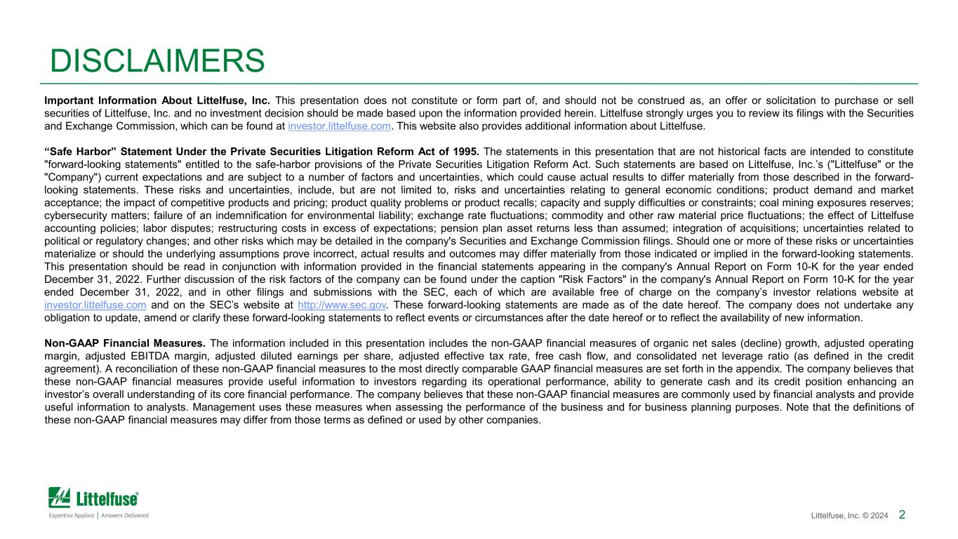 2Littelfuse, Inc. © 2024 Important Information About Littelfuse, Inc. This presentation does not constitute or form part of, and should not be construed as, an offer or solicitation to purchase or sell securities of Littelfuse, Inc. and no investment decision should be made based upon the information provided herein. Littelfuse strongly urges you to review its filings with the Securities and Exchange Commission, which can be found at investor.littelfuse.com. This website also provides additional information about Littelfuse. “Safe Harbor” Statement Under the Private Securities Litigation Reform Act of 1995. The statements in this presentation that are not historical facts are intended to constitute "forward-looking statements" entitled to the safe-harbor provisions of the Private Securities Litigation Reform Act. Such statements are based on Littelfuse, Inc.’s ("Littelfuse" or the "Company") current expectations and are subject to a number of factors and uncertainties, which could cause actual results to differ materially from those described in the forward- looking statements. These risks and uncertainties, include, but are not limited to, risks and uncertainties relating to general economic conditions; product demand and market acceptance; the impact of competitive products and pricing; product quality problems or product recalls; capacity and supply difficulties or constraints; coal mining exposures reserves; cybersecurity matters; failure of an indemnification for environmental liability; exchange rate fluctuations; commodity and other raw material price fluctuations; the effect of Littelfuse accounting policies; labor disputes; restructuring costs in excess of expectations; pension plan asset returns less than assumed; integration of acquisitions; uncertainties related to political or regulatory changes; and other risks which may be detailed in the company's Securities and Exchange Commission filings. Should one or more of these risks or uncertainties materialize or should the underlying assumptions prove incorrect, actual results and outcomes may differ materially from those indicated or implied in the forward-looking statements. This presentation should be read in conjunction with information provided in the financial statements appearing in the company's Annual Report on Form 10-K for the year ended December 31, 2022. Further discussion of the risk factors of the company can be found under the caption "Risk Factors" in the company's Annual Report on Form 10-K for the year ended December 31, 2022, and in other filings and submissions with the SEC, each of which are available free of charge on the company’s investor relations website at investor.littelfuse.com and on the SEC’s website at http://www.sec.gov. These forward-looking statements are made as of the date hereof. The company does not undertake any obligation to update, amend or clarify these forward-looking statements to reflect events or circumstances after the date hereof or to reflect the availability of new information. Non-GAAP Financial Measures. The information included in this presentation includes the non-GAAP financial measures of organic net sales (decline) growth, adjusted operating margin, adjusted EBITDA margin, adjusted diluted earnings per share, adjusted effective tax rate, free cash flow, and consolidated net leverage ratio (as defined in the credit agreement). A reconciliation of these non-GAAP financial measures to the most directly comparable GAAP financial measures are set forth in the appendix. The company believes that these non-GAAP financial measures provide useful information to investors regarding its operational performance, ability to generate cash and its credit position enhancing an investor’s overall understanding of its core financial performance. The company believes that these non-GAAP financial measures are commonly used by financial analysts and provide useful information to analysts. Management uses these measures when assessing the performance of the business and for business planning purposes. Note that the definitions of these non-GAAP financial measures may differ from those terms as defined or used by other companies. DISCLAIMERS
