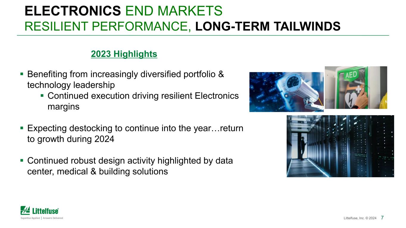 6Littelfuse, Inc. © 2024 REVISITING OUR 2021 – 2025 FRAMEWORK EXECUTING ON OUR GROWTH STRATEGY REVENUE • Double-digit revenue CAGR • 5 – 7% organic • 5 – 7% from acquisitions EARNINGS • EPS growth > revenue growth • 17 – 19% operating margins • 21 – 23% EBITDA margins CASH FLOW • 100%+ free cash flow conversion • Capital expenditures 4 – 5% of revenue ROIC • 5-year goal: high-teens ROIC % • Near-term objective: mid-teens ROIC % CAPITAL ALLOCATION • Return 40% of free cash flow to shareholders • Remainder to focus on acquisitions ‘20 – ‘23 Sales CAGR: +18% ‘20 – ‘23 EPS CAGR: +22% ‘20 – ‘23 FCF CAGR: +23% 106% Conversion ‘20 – ‘23 ROIC Upper-teens % ~$1.2B+ Capital Deployed