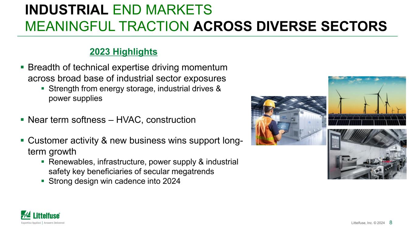 7Littelfuse, Inc. © 2024 ELECTRONICS END MARKETS RESILIENT PERFORMANCE, LONG-TERM TAILWINDS  Benefiting from increasingly diversified portfolio & technology leadership  Continued execution driving resilient Electronics margins  Expecting destocking to continue into the year…return to growth during 2024  Continued robust design activity highlighted by data center, medical & building solutions 2023 Highlights