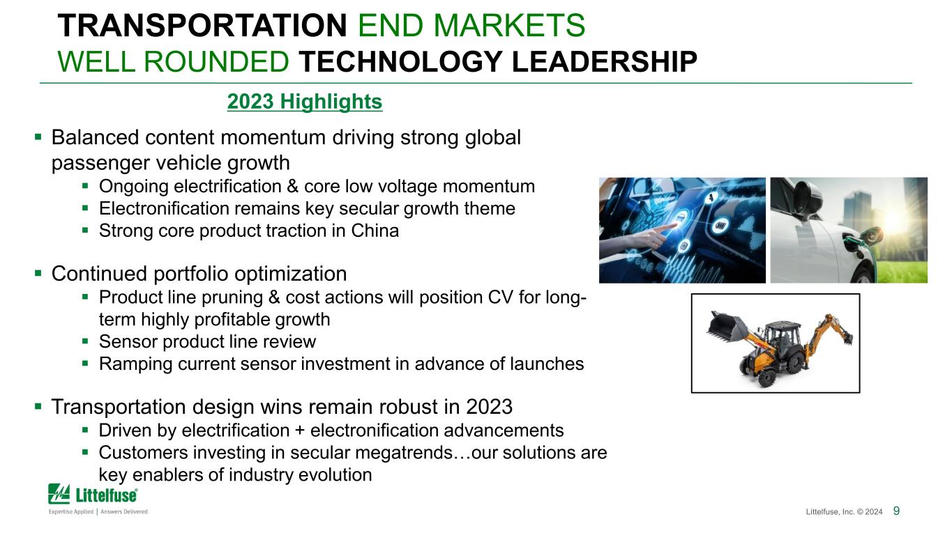 8Littelfuse, Inc. © 2024 INDUSTRIAL END MARKETS MEANINGFUL TRACTION ACROSS DIVERSE SECTORS  Breadth of technical expertise driving momentum across broad base of industrial sector exposures  Strength from energy storage, industrial drives & power supplies  Near term softness – HVAC, construction  Customer activity & new business wins support long- term growth  Renewables, infrastructure, power supply & industrial safety key beneficiaries of secular megatrends  Strong design win cadence into 2024 2023 Highlights
