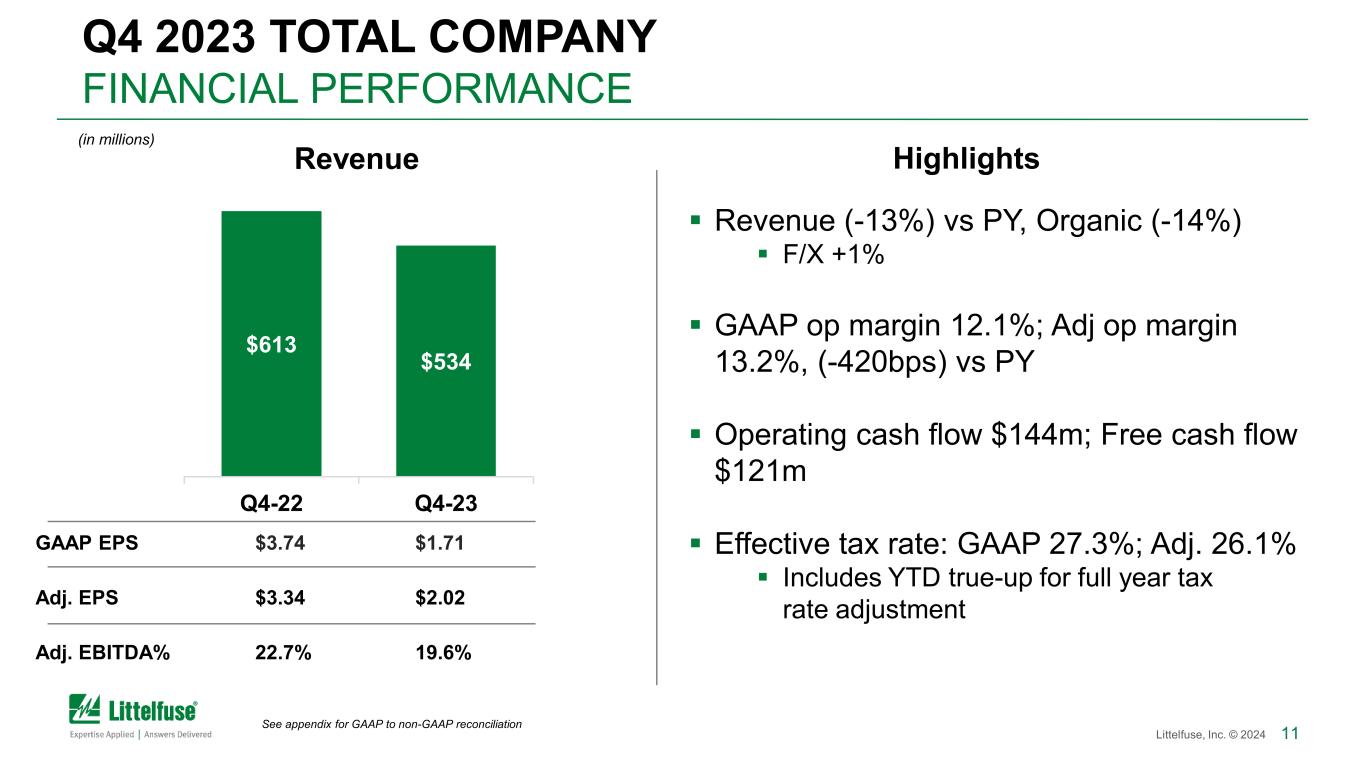 12Littelfuse, Inc. © 2024 FY 2023 TOTAL COMPANY FINANCIAL PERFORMANCE GAAP EPS $14.94 $10.34 Adj. EPS $16.87 $11.74 Adj. EBITDA% 26.4% 22.3% (in millions) See appendix for GAAP to non-GAAP reconciliation Highlights  Revenue (-6%) vs PY, Organic (-10%)  GAAP op margin 15.3%; Adj. op margin 16.5%, (-520bps) vs PY  Ex. F/X impact, ~17% adj. op margin  Effective tax rate: GAAP 21.0%; Adj. 20.1%  +150bps higher than projected, earnings mix shifts across jurisdictions  Operating cash flow $457m; Free cash flow $371m  Both records for the company  Free cash flow conversion of net income 143%  YE 2023 net debt to EBITDA leverage 1.3x $2,514 $2,363 FY-22 FY-23 Revenue