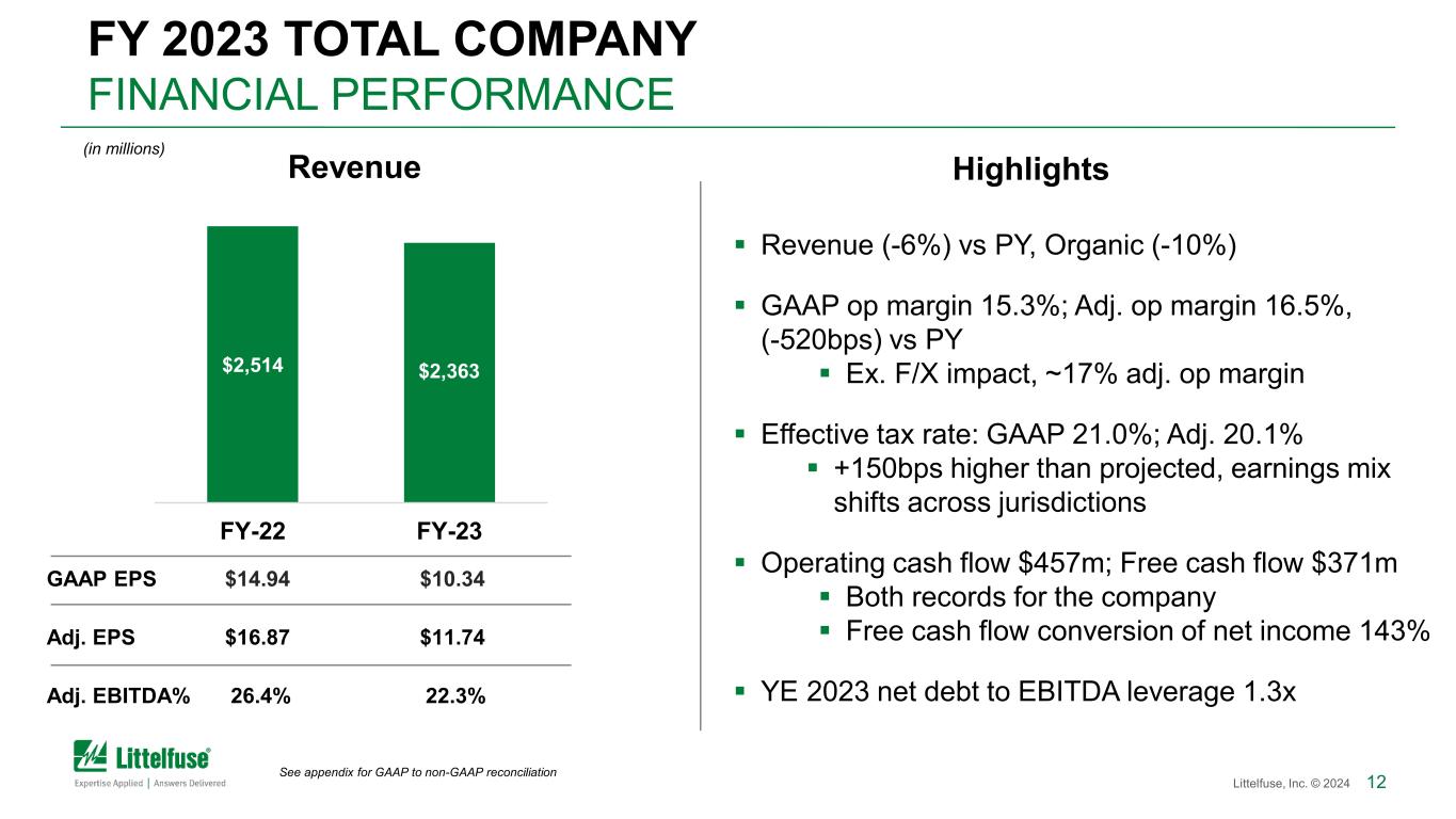 11Littelfuse, Inc. © 2024  Revenue (-13%) vs PY, Organic (-14%)  F/X +1%  GAAP op margin 12.1%; Adj op margin 13.2%, (-420bps) vs PY  Operating cash flow $144m; Free cash flow $121m  Effective tax rate: GAAP 27.3%; Adj. 26.1%  Includes YTD true-up for full year tax rate adjustment Q4 2023 TOTAL COMPANY FINANCIAL PERFORMANCE GAAP EPS $3.74 $1.71 Adj. EPS $3.34 $2.02 Adj. EBITDA% 22.7% 19.6% $613 $534 Q4-22 Q4-23 Revenue (in millions) See appendix for GAAP to non-GAAP reconciliation Highlights