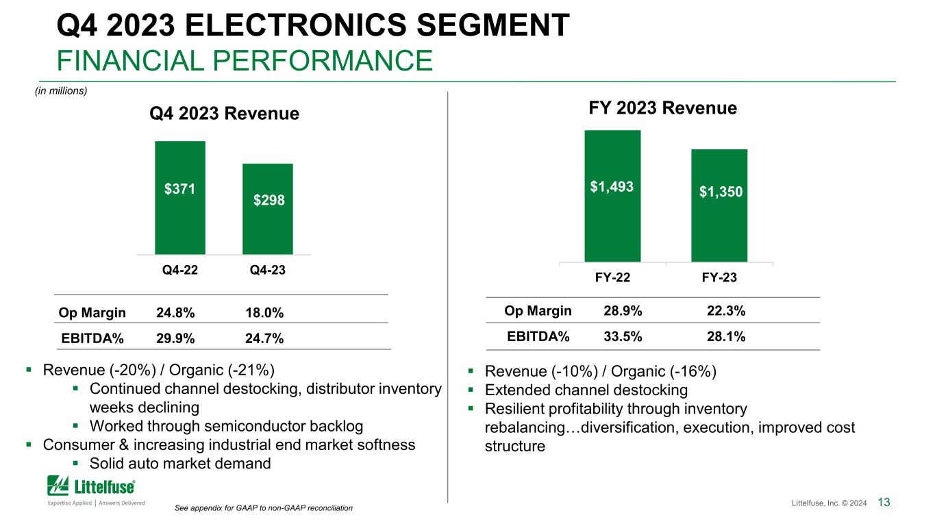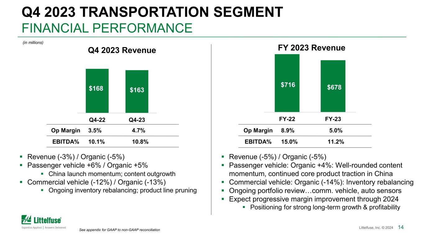 13Littelfuse, Inc. © 2024 Op Margin 28.9% 22.3% EBITDA% 33.5% 28.1% $1,493 $1,350 FY-22 FY-23 FY 2023 Revenue Op Margin 24.8% 18.0% EBITDA% 29.9% 24.7% $371 $298 Q4-22 Q4-23 Q4 2023 Revenue Q4 2023 ELECTRONICS SEGMENT FINANCIAL PERFORMANCE (in millions)  Revenue (-10%) / Organic (-16%)  Extended channel destocking  Resilient profitability through inventory rebalancing…diversification, execution, improved cost structure  Revenue (-20%) / Organic (-21%)  Continued channel destocking, distributor inventory weeks declining  Worked through semiconductor backlog  Consumer & increasing industrial end market softness  Solid auto market demand See appendix for GAAP to non-GAAP reconciliation