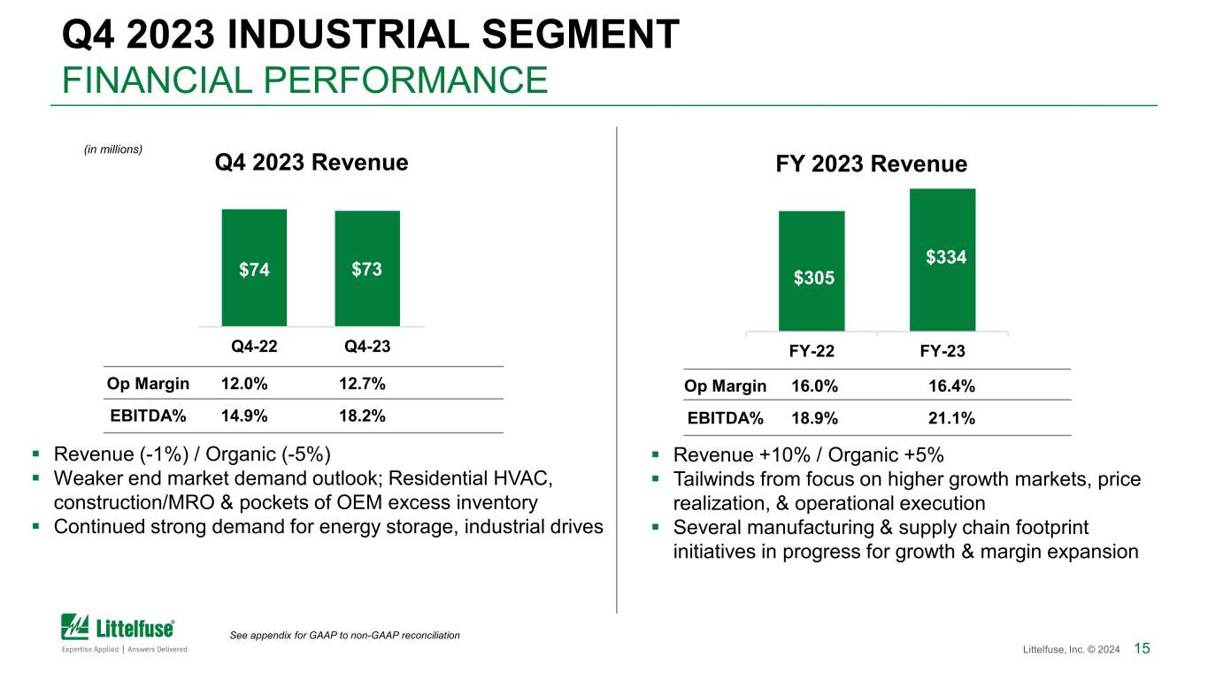 14Littelfuse, Inc. © 2024 Q4 2023 TRANSPORTATION SEGMENT FINANCIAL PERFORMANCE (in millions) See appendix for GAAP to non-GAAP reconciliation $168 $163 Q4-22 Q4-23 Q4 2023 Revenue $716 $678 FY-22 FY-23 FY 2023 Revenue Op Margin 8.9% 5.0% EBITDA% 15.0% 11.2% Op Margin 3.5% 4.7% EBITDA% 10.1% 10.8%  Revenue (-3%) / Organic (-5%)  Passenger vehicle +6% / Organic +5%  China launch momentum; content outgrowth  Commercial vehicle (-12%) / Organic (-13%)  Ongoing inventory rebalancing; product line pruning  Revenue (-5%) / Organic (-5%)  Passenger vehicle: Organic +4%: Well-rounded content momentum, continued core product traction in China  Commercial vehicle: Organic (-14%): Inventory rebalancing  Ongoing portfolio review…comm. vehicle, auto sensors  Expect progressive margin improvement through 2024  Positioning for strong long-term growth & profitability