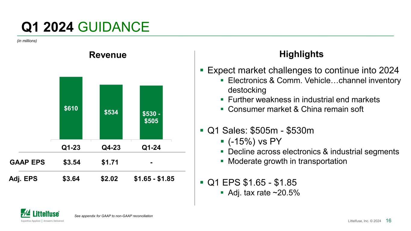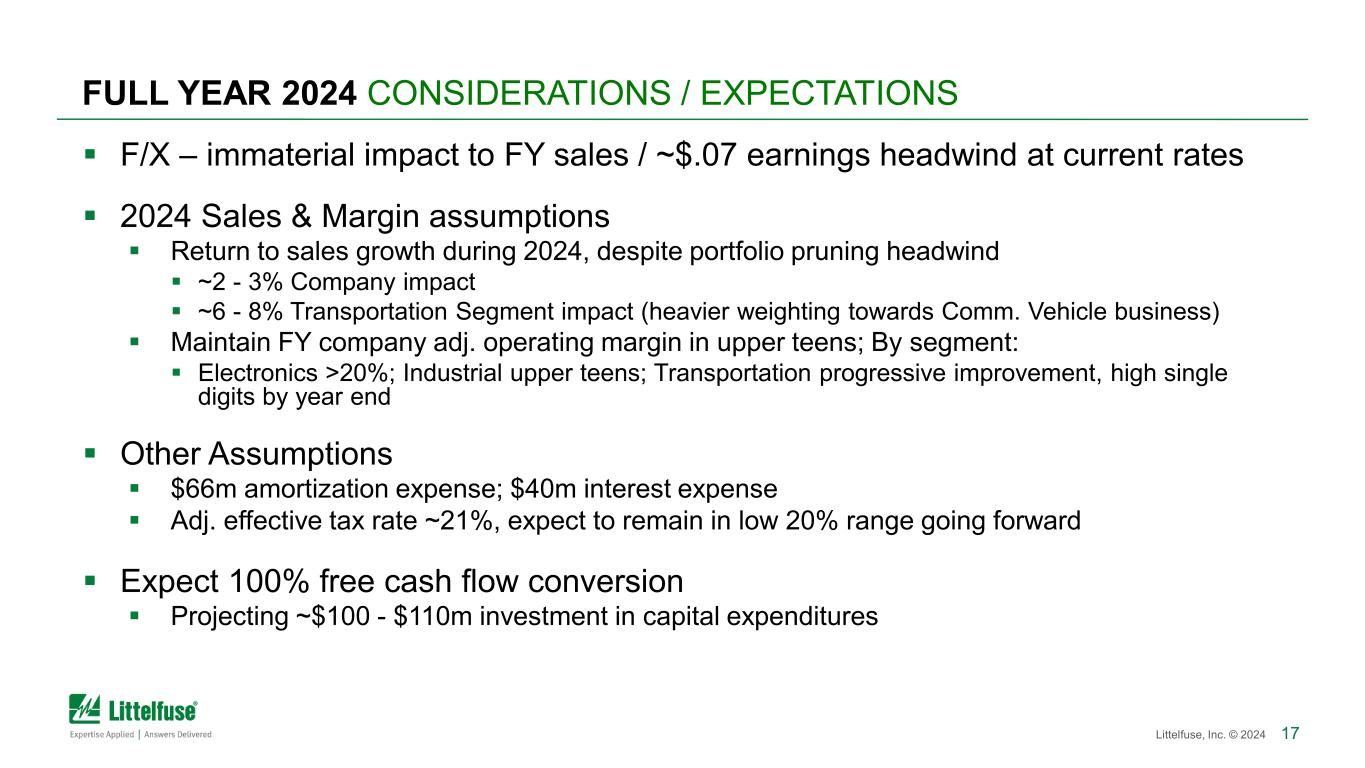 16Littelfuse, Inc. © 2024 Q1 2024 GUIDANCE  Expect market challenges to continue into 2024  Electronics & Comm. Vehicle…channel inventory destocking  Further weakness in industrial end markets  Consumer market & China remain soft  Q1 Sales: $505m - $530m  (-15%) vs PY  Decline across electronics & industrial segments  Moderate growth in transportation  Q1 EPS $1.65 - $1.85  Adj. tax rate ~20.5% (in millions) See appendix for GAAP to non-GAAP reconciliation $610 $534 $530 - $505 Q1-23 Q4-23 Q1-24 Revenue Adj. EPS $3.64 $2.02 $1.65 - $1.85 GAAP EPS $3.54 $1.71 - Highlights