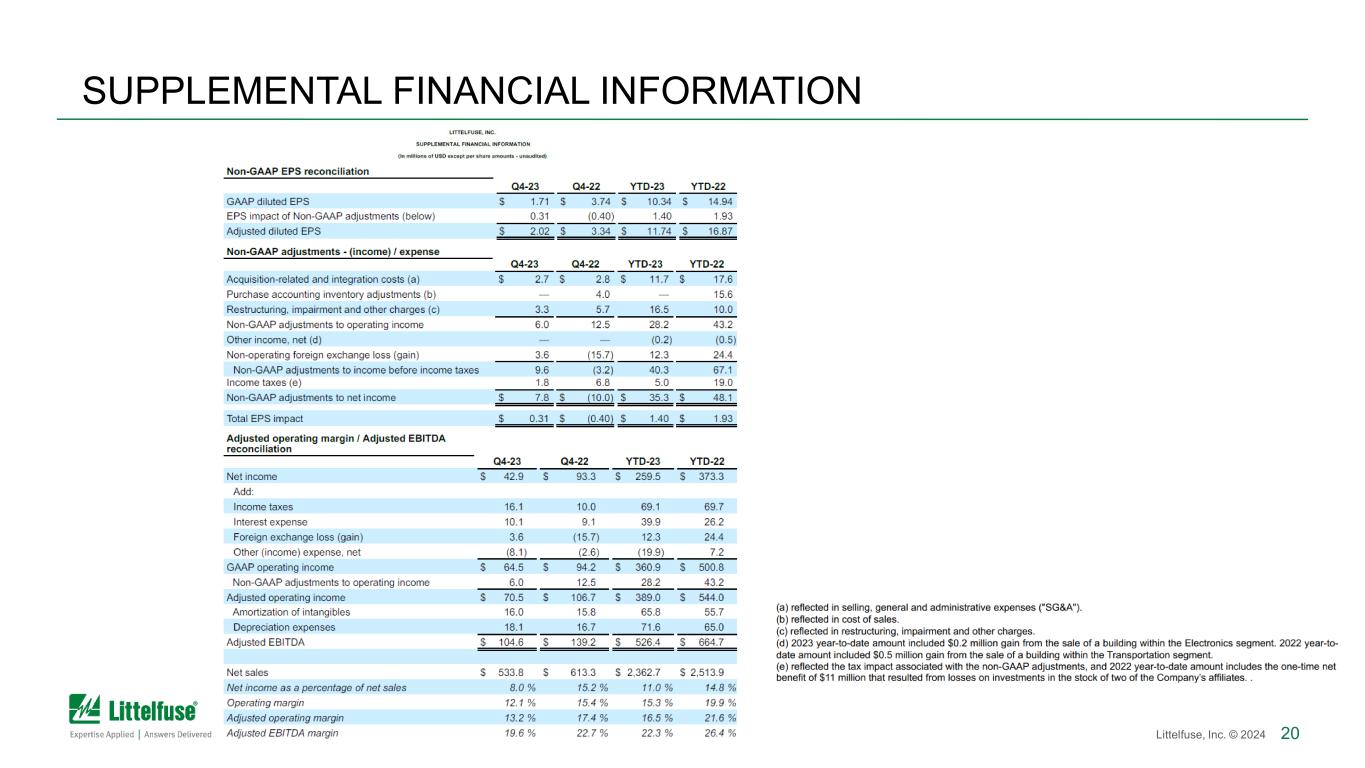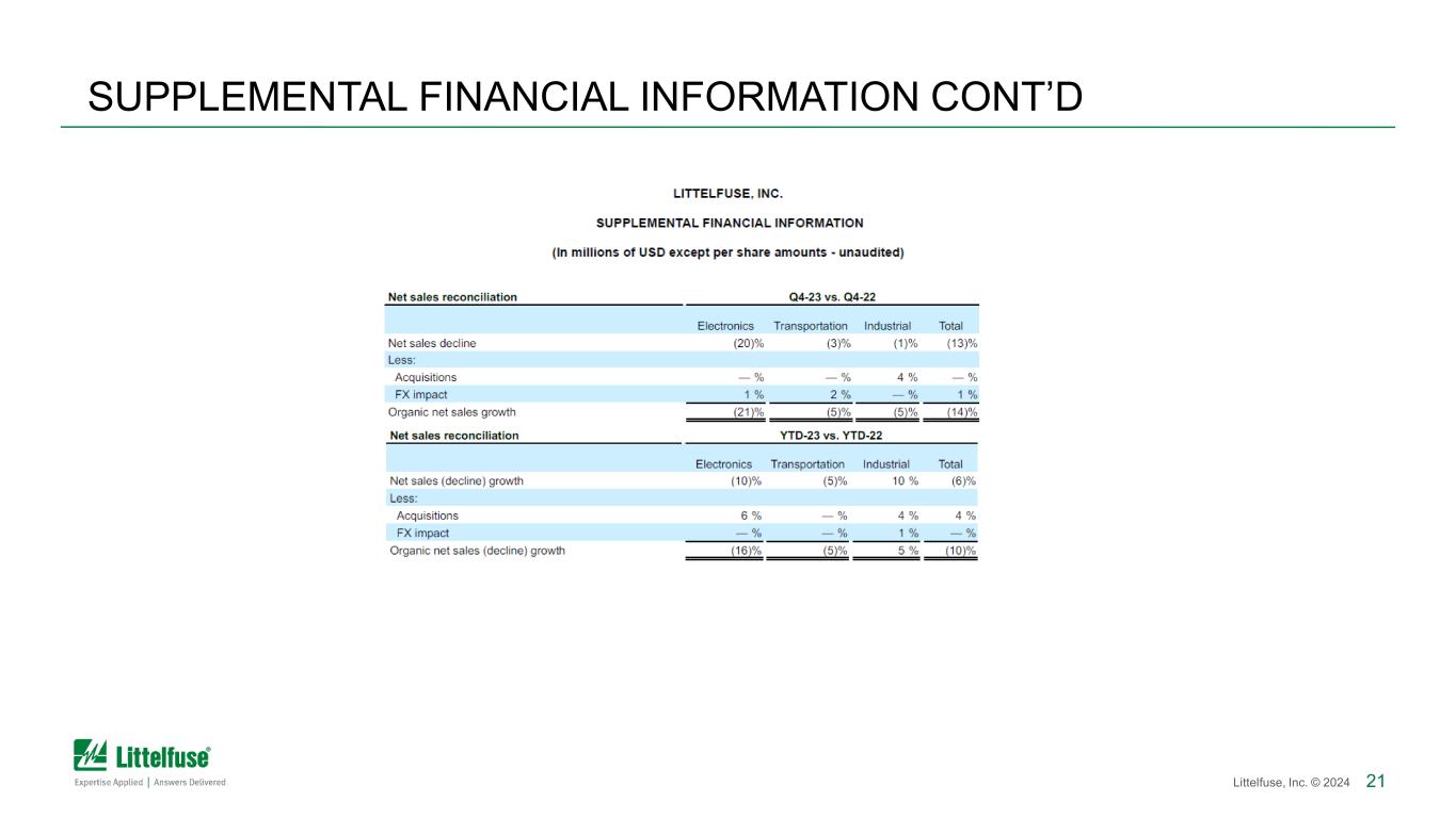 20Littelfuse, Inc. © 2024 SUPPLEMENTAL FINANCIAL INFORMATION