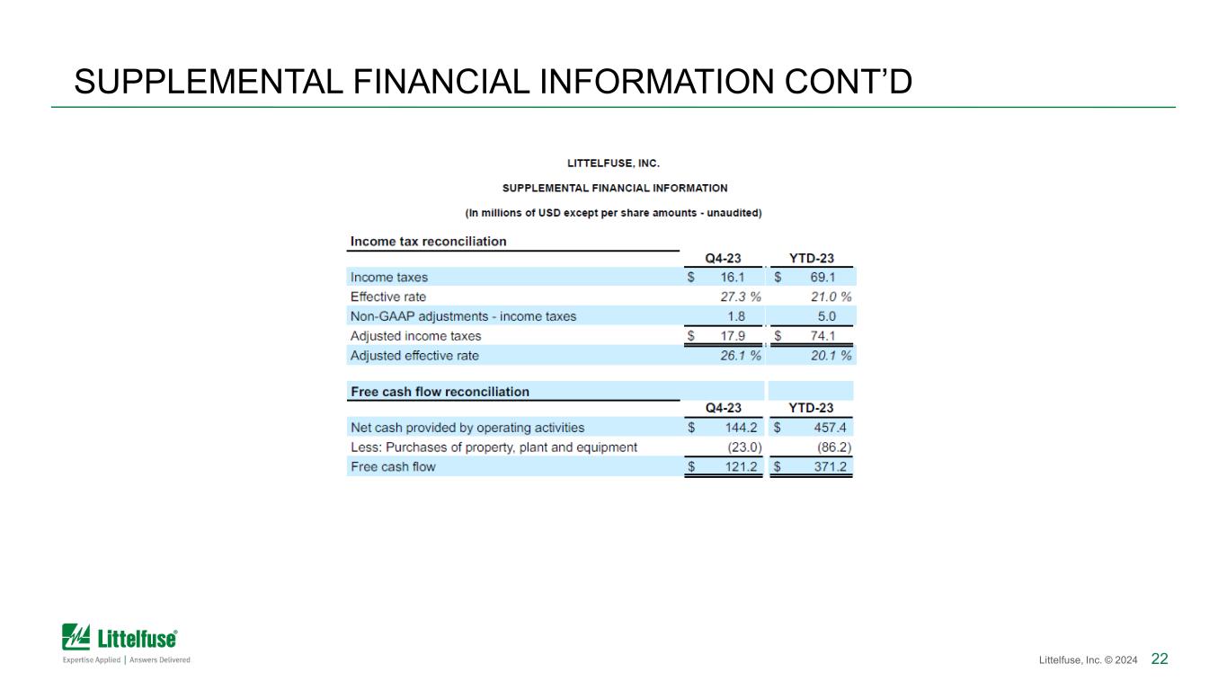 21Littelfuse, Inc. © 2024 SUPPLEMENTAL FINANCIAL INFORMATION CONT’D