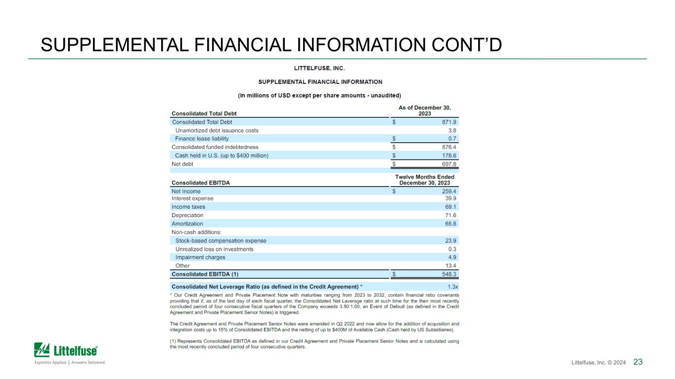 22Littelfuse, Inc. © 2024 SUPPLEMENTAL FINANCIAL INFORMATION CONT’D