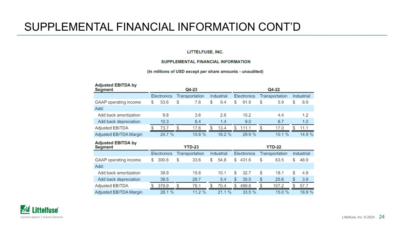 23Littelfuse, Inc. © 2024 SUPPLEMENTAL FINANCIAL INFORMATION CONT’D