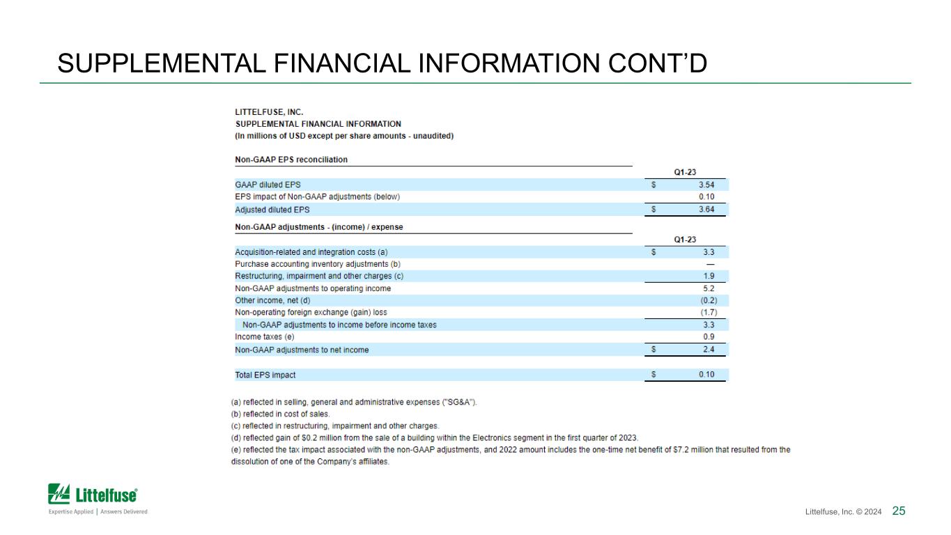 24Littelfuse, Inc. © 2024 SUPPLEMENTAL FINANCIAL INFORMATION CONT’D