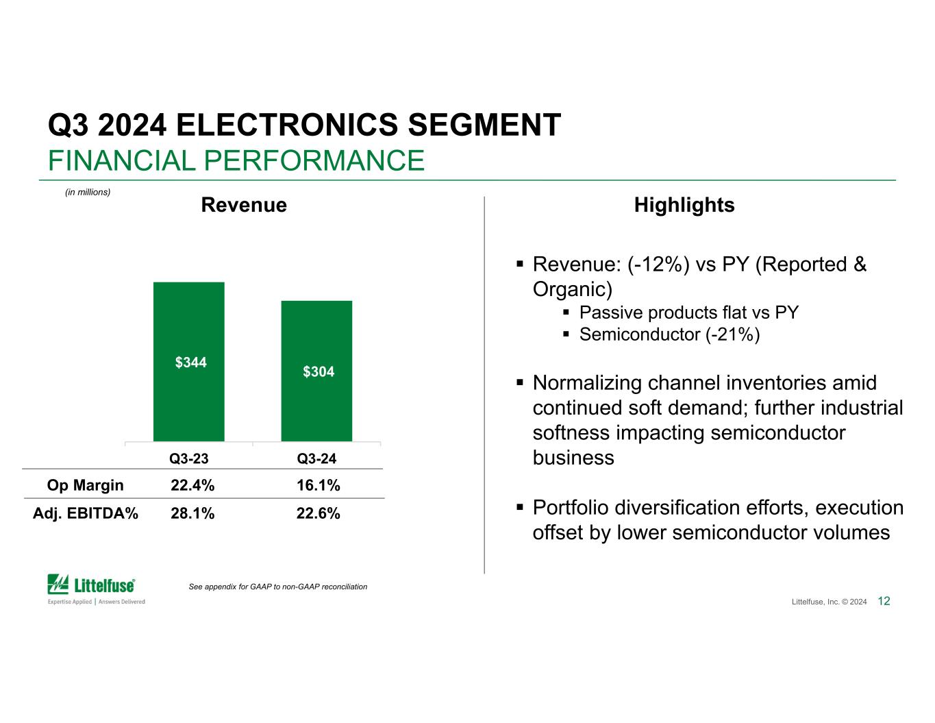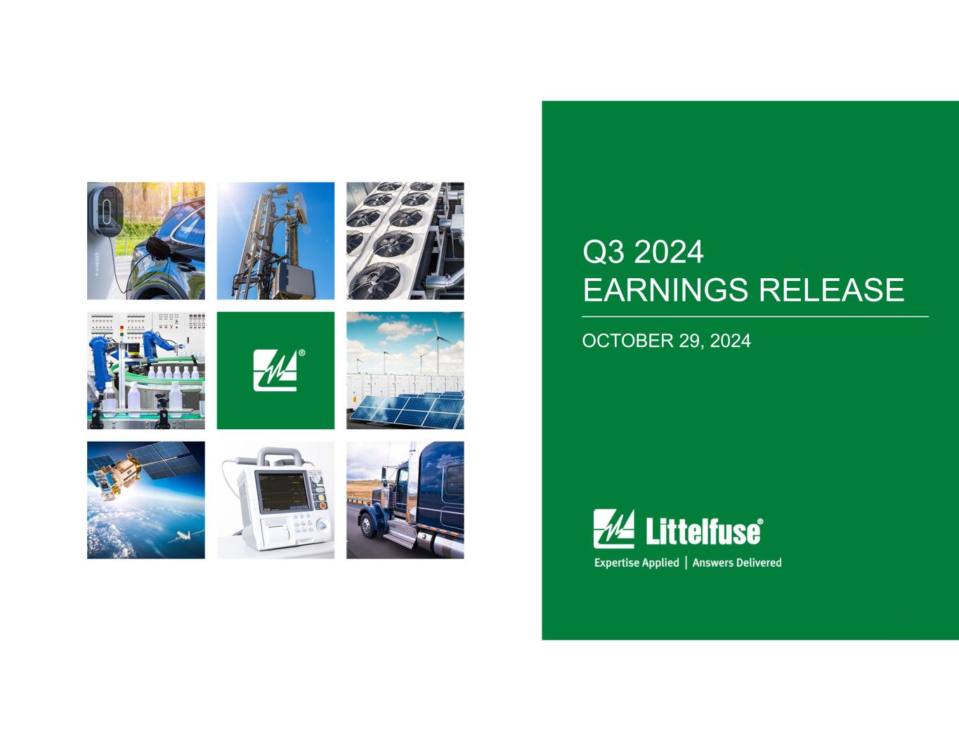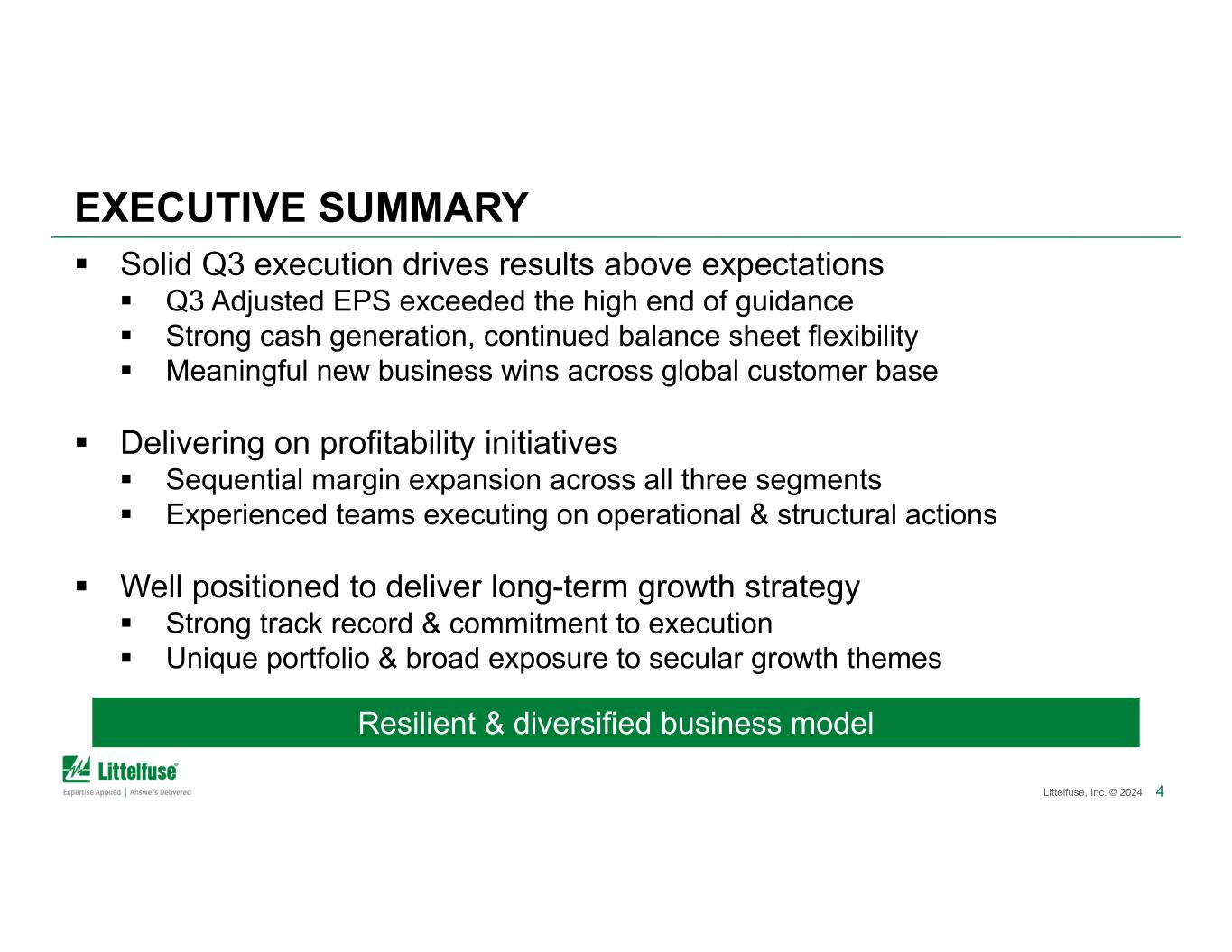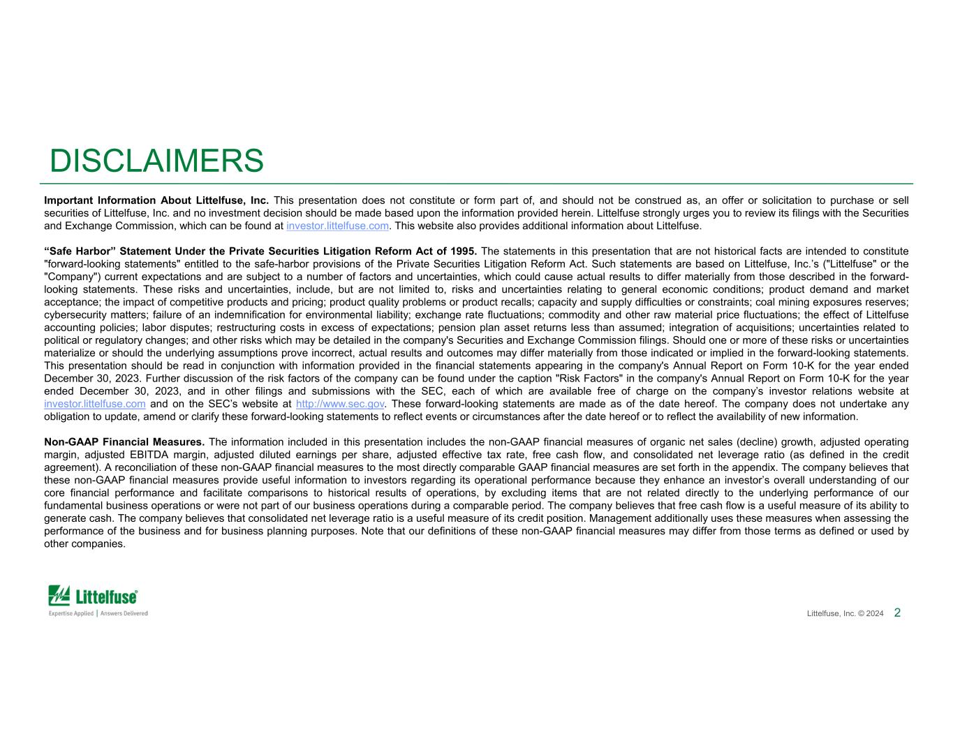 2Littelfuse, Inc. © 2024 Important Information About Littelfuse, Inc. This presentation does not constitute or form part of, and should not be construed as, an offer or solicitation to purchase or sell securities of Littelfuse, Inc. and no investment decision should be made based upon the information provided herein. Littelfuse strongly urges you to review its filings with the Securities and Exchange Commission, which can be found at investor.littelfuse.com. This website also provides additional information about Littelfuse. “Safe Harbor” Statement Under the Private Securities Litigation Reform Act of 1995. The statements in this presentation that are not historical facts are intended to constitute "forward-looking statements" entitled to the safe-harbor provisions of the Private Securities Litigation Reform Act. Such statements are based on Littelfuse, Inc.’s ("Littelfuse" or the "Company") current expectations and are subject to a number of factors and uncertainties, which could cause actual results to differ materially from those described in the forward- looking statements. These risks and uncertainties, include, but are not limited to, risks and uncertainties relating to general economic conditions; product demand and market acceptance; the impact of competitive products and pricing; product quality problems or product recalls; capacity and supply difficulties or constraints; coal mining exposures reserves; cybersecurity matters; failure of an indemnification for environmental liability; exchange rate fluctuations; commodity and other raw material price fluctuations; the effect of Littelfuse accounting policies; labor disputes; restructuring costs in excess of expectations; pension plan asset returns less than assumed; integration of acquisitions; uncertainties related to political or regulatory changes; and other risks which may be detailed in the company's Securities and Exchange Commission filings. Should one or more of these risks or uncertainties materialize or should the underlying assumptions prove incorrect, actual results and outcomes may differ materially from those indicated or implied in the forward-looking statements. This presentation should be read in conjunction with information provided in the financial statements appearing in the company's Annual Report on Form 10-K for the year ended December 30, 2023. Further discussion of the risk factors of the company can be found under the caption "Risk Factors" in the company's Annual Report on Form 10-K for the year ended December 30, 2023, and in other filings and submissions with the SEC, each of which are available free of charge on the company’s investor relations website at investor.littelfuse.com and on the SEC’s website at http://www.sec.gov. These forward-looking statements are made as of the date hereof. The company does not undertake any obligation to update, amend or clarify these forward-looking statements to reflect events or circumstances after the date hereof or to reflect the availability of new information. Non-GAAP Financial Measures. The information included in this presentation includes the non-GAAP financial measures of organic net sales (decline) growth, adjusted operating margin, adjusted EBITDA margin, adjusted diluted earnings per share, adjusted effective tax rate, free cash flow, and consolidated net leverage ratio (as defined in the credit agreement). A reconciliation of these non-GAAP financial measures to the most directly comparable GAAP financial measures are set forth in the appendix. The company believes that these non-GAAP financial measures provide useful information to investors regarding its operational performance because they enhance an investor’s overall understanding of our core financial performance and facilitate comparisons to historical results of operations, by excluding items that are not related directly to the underlying performance of our fundamental business operations or were not part of our business operations during a comparable period. The company believes that free cash flow is a useful measure of its ability to generate cash. The company believes that consolidated net leverage ratio is a useful measure of its credit position. Management additionally uses these measures when assessing the performance of the business and for business planning purposes. Note that our definitions of these non-GAAP financial measures may differ from those terms as defined or used by other companies. DISCLAIMERS