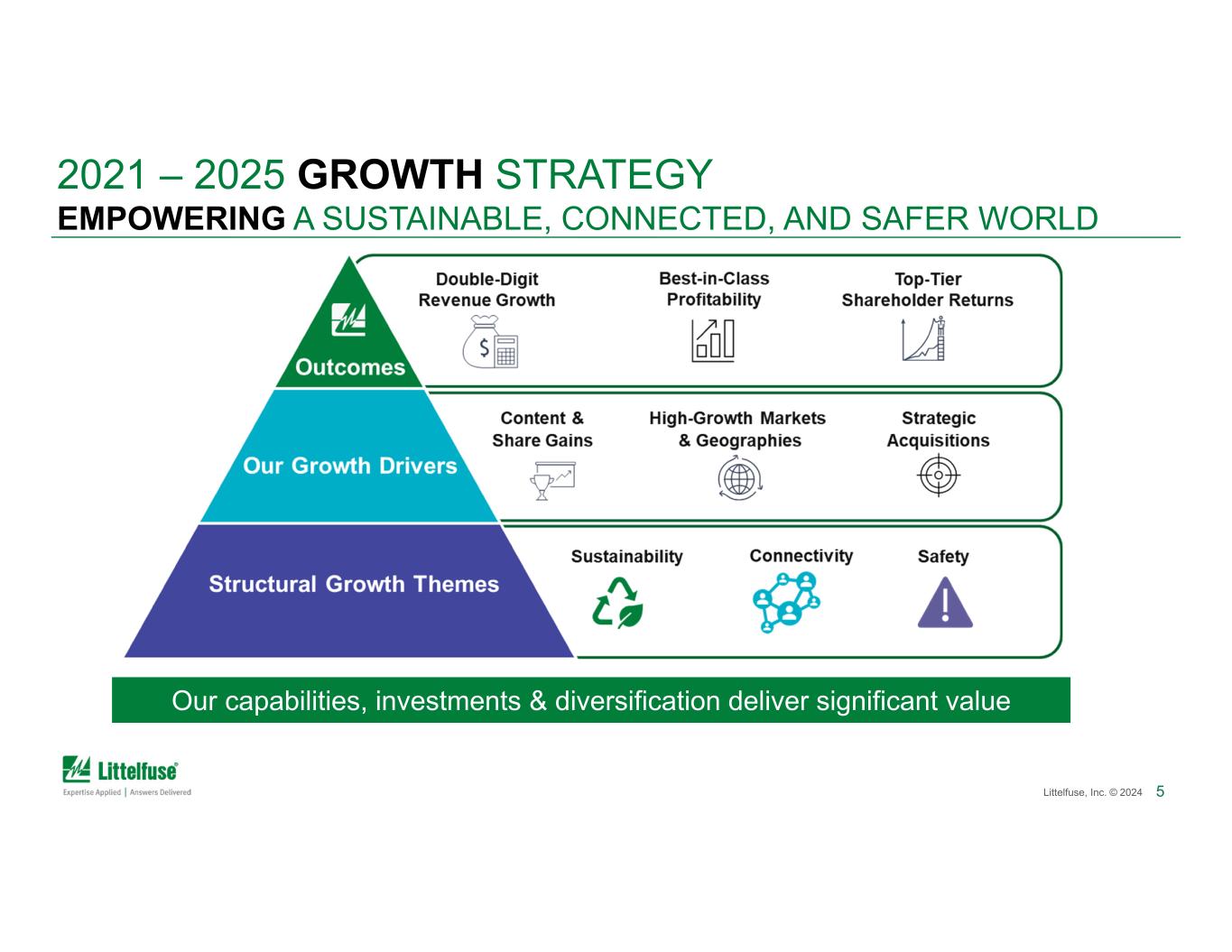 4Littelfuse, Inc. © 2024 EXECUTIVE SUMMARY Resilient & diversified business model  Solid Q3 execution drives results above expectations  Q3 Adjusted EPS exceeded the high end of guidance  Strong cash generation, continued balance sheet flexibility  Meaningful new business wins across global customer base  Delivering on profitability initiatives  Sequential margin expansion across all three segments  Experienced teams executing on operational & structural actions  Well positioned to deliver long-term growth strategy  Strong track record & commitment to execution  Unique portfolio & broad exposure to secular growth themes