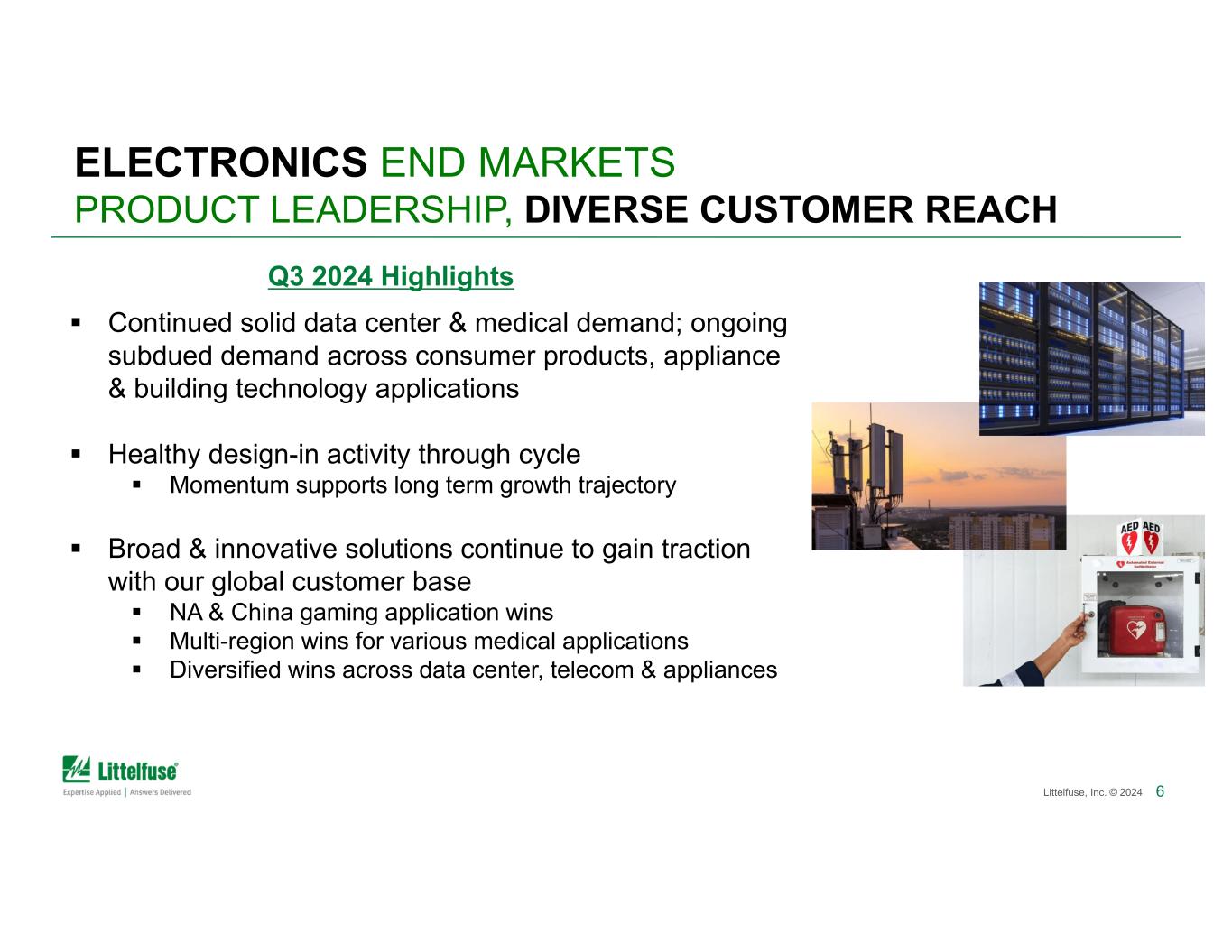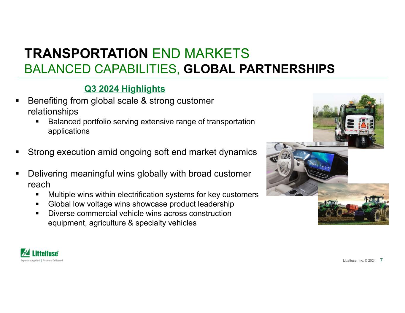 6Littelfuse, Inc. © 2024 ELECTRONICS END MARKETS PRODUCT LEADERSHIP, DIVERSE CUSTOMER REACH  Continued solid data center & medical demand; ongoing subdued demand across consumer products, appliance & building technology applications  Healthy design-in activity through cycle  Momentum supports long term growth trajectory  Broad & innovative solutions continue to gain traction with our global customer base  NA & China gaming application wins  Multi-region wins for various medical applications  Diversified wins across data center, telecom & appliances Q3 2024 Highlights