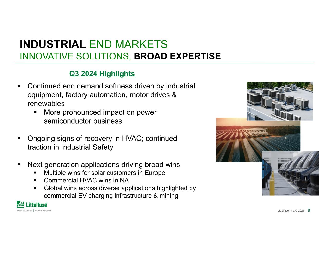 7Littelfuse, Inc. © 2024 TRANSPORTATION END MARKETS BALANCED CAPABILITIES, GLOBAL PARTNERSHIPS  Benefiting from global scale & strong customer relationships  Balanced portfolio serving extensive range of transportation applications  Strong execution amid ongoing soft end market dynamics  Delivering meaningful wins globally with broad customer reach  Multiple wins within electrification systems for key customers  Global low voltage wins showcase product leadership  Diverse commercial vehicle wins across construction equipment, agriculture & specialty vehicles Q3 2024 Highlights