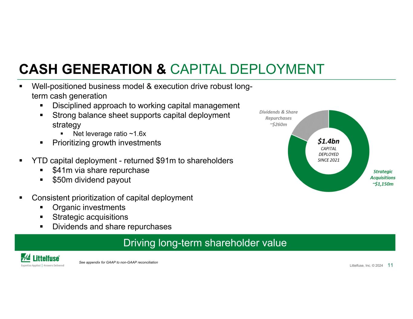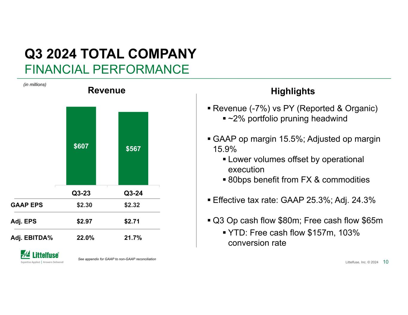 10Littelfuse, Inc. © 2024 Q3 2024 TOTAL COMPANY FINANCIAL PERFORMANCE $2.32$2.30GAAP EPS $2.71$2.97Adj. EPS 21.7%22.0%Adj. EBITDA% $607 $567 Q3-23 Q3-24 Revenue (in millions) See appendix for GAAP to non-GAAP reconciliation Highlights  Revenue (-7%) vs PY (Reported & Organic)  ~2% portfolio pruning headwind GAAP op margin 15.5%; Adjusted op margin 15.9%  Lower volumes offset by operational execution  80bps benefit from FX & commodities  Effective tax rate: GAAP 25.3%; Adj. 24.3% Q3 Op cash flow $80m; Free cash flow $65m  YTD: Free cash flow $157m, 103% conversion rate