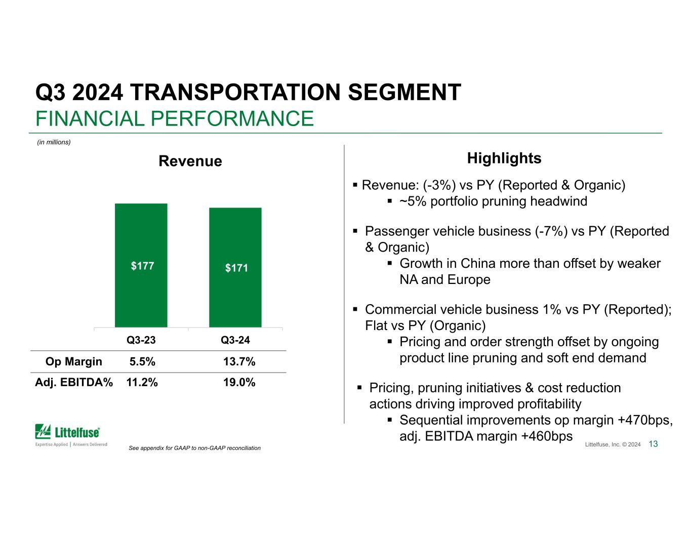 12Littelfuse, Inc. © 2024 $344 $304 Q3-23 Q3-24 Q3 2024 ELECTRONICS SEGMENT FINANCIAL PERFORMANCE Revenue (in millions) 16.1%22.4%Op Margin 22.6%28.1%Adj. EBITDA% Highlights See appendix for GAAP to non-GAAP reconciliation  Revenue: (-12%) vs PY (Reported & Organic)  Passive products flat vs PY  Semiconductor (-21%)  Normalizing channel inventories amid continued soft demand; further industrial softness impacting semiconductor business  Portfolio diversification efforts, execution offset by lower semiconductor volumes