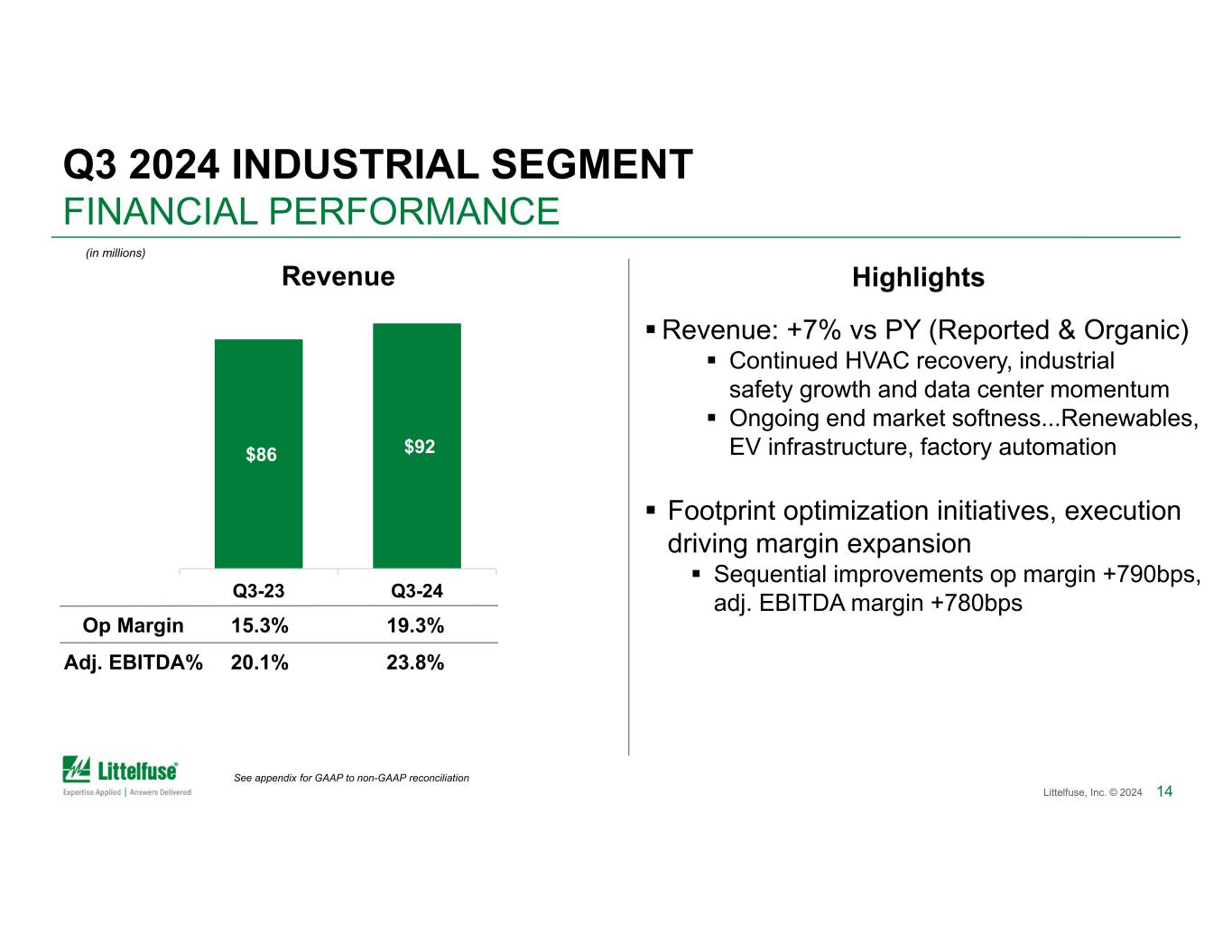 13Littelfuse, Inc. © 2024 $177 $171 Q3-23 Q3-24 Q3 2024 TRANSPORTATION SEGMENT FINANCIAL PERFORMANCE Revenue (in millions) 13.7%5.5%Op Margin 19.0%11.2%Adj. EBITDA% See appendix for GAAP to non-GAAP reconciliation Highlights  Revenue: (-3%) vs PY (Reported & Organic)  ~5% portfolio pruning headwind  Passenger vehicle business (-7%) vs PY (Reported & Organic)  Growth in China more than offset by weaker NA and Europe  Commercial vehicle business 1% vs PY (Reported); Flat vs PY (Organic)  Pricing and order strength offset by ongoing product line pruning and soft end demand  Pricing, pruning initiatives & cost reduction actions driving improved profitability  Sequential improvements op margin +470bps, adj. EBITDA margin +460bps