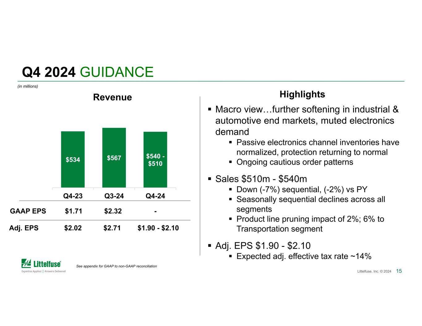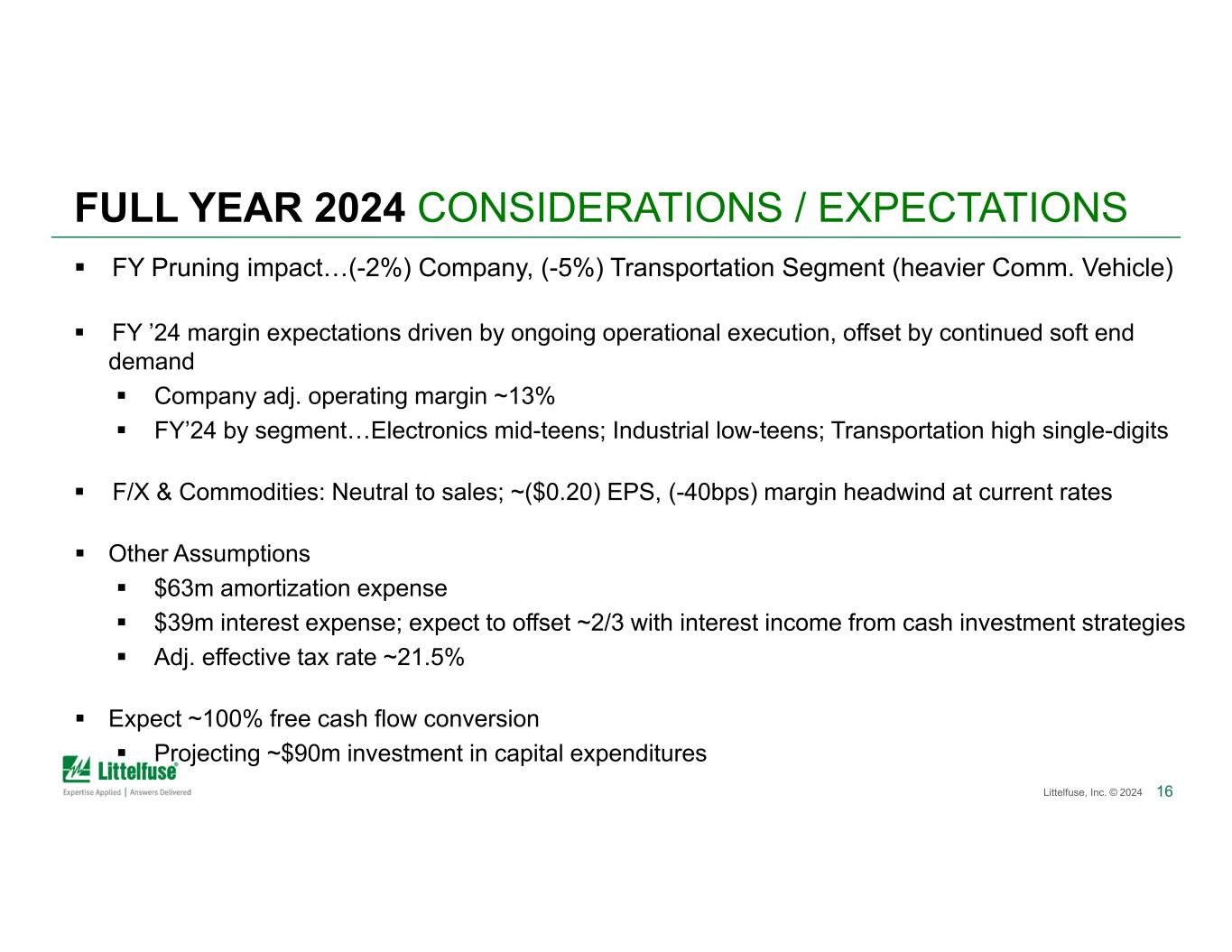 15Littelfuse, Inc. © 2024 Q4 2024 GUIDANCE  Macro view…further softening in industrial & automotive end markets, muted electronics demand  Passive electronics channel inventories have normalized, protection returning to normal  Ongoing cautious order patterns  Sales $510m - $540m  Down (-7%) sequential, (-2%) vs PY  Seasonally sequential declines across all segments  Product line pruning impact of 2%; 6% to Transportation segment  Adj. EPS $1.90 - $2.10  Expected adj. effective tax rate ~14% (in millions) See appendix for GAAP to non-GAAP reconciliation $534 $567 $540 - $510 Q4-23 Q3-24 Q4-24 Revenue $1.90 - $2.10$2.02 $2.71Adj. EPS -$1.71 $2.32GAAP EPS Highlights