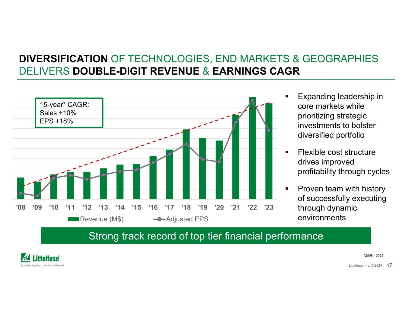 16Littelfuse, Inc. © 2024 FULL YEAR 2024 CONSIDERATIONS / EXPECTATIONS  FY Pruning impact…(-2%) Company, (-5%) Transportation Segment (heavier Comm. Vehicle)  FY ’24 margin expectations driven by ongoing operational execution, offset by continued soft end demand  Company adj. operating margin ~13%  FY’24 by segment…Electronics mid-teens; Industrial low-teens; Transportation high single-digits  F/X & Commodities: Neutral to sales; ~($0.20) EPS, (-40bps) margin headwind at current rates  Other Assumptions  $63m amortization expense  $39m interest expense; expect to offset ~2/3 with interest income from cash investment strategies  Adj. effective tax rate ~21.5%  Expect ~100% free cash flow conversion  Projecting ~$90m investment in capital expenditures