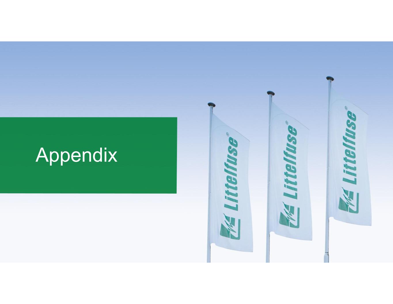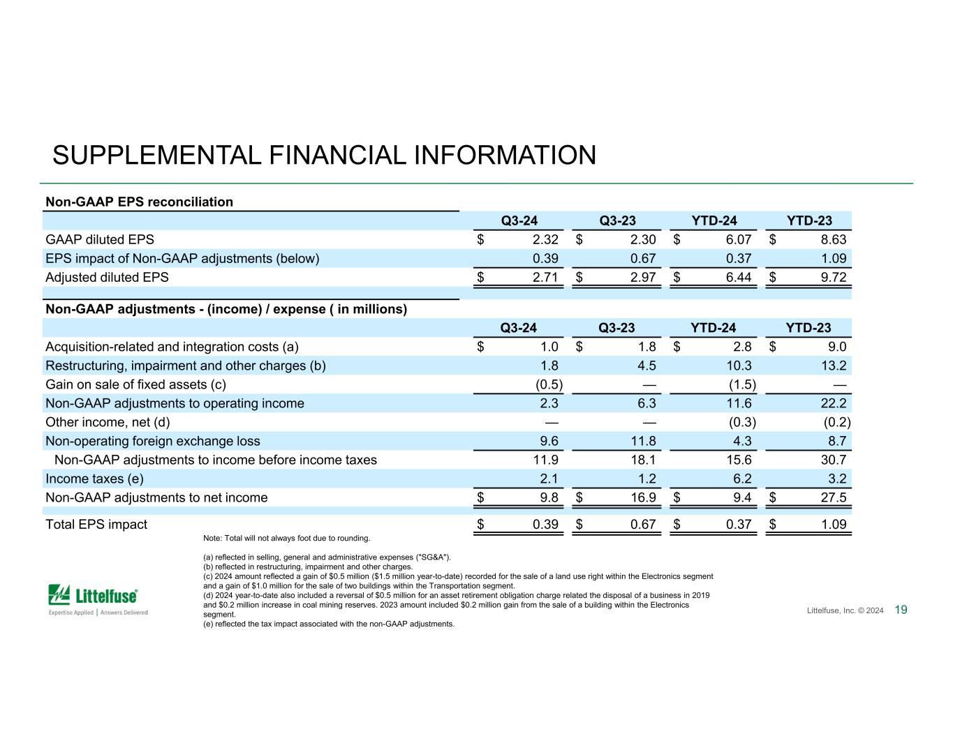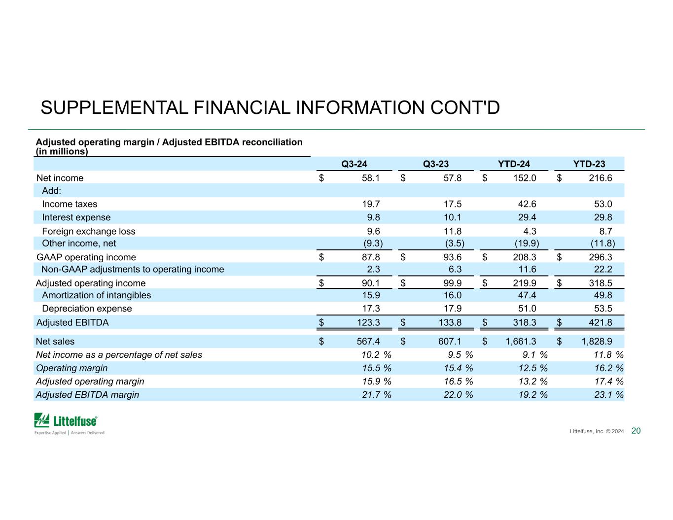19Littelfuse, Inc. © 2024 SUPPLEMENTAL FINANCIAL INFORMATION Non-GAAP EPS reconciliation YTD-23YTD-24Q3-23Q3-24 $ 8.63$ 6.07$ 2.30$ 2.32GAAP diluted EPS 1.090.370.670.39EPS impact of Non-GAAP adjustments (below) $ 9.72$ 6.44$ 2.97$ 2.71Adjusted diluted EPS Non-GAAP adjustments - (income) / expense ( in millions) YTD-23YTD-24Q3-23Q3-24 $ 9.0$ 2.8$ 1.8$ 1.0Acquisition-related and integration costs (a) 13.210.34.51.8Restructuring, impairment and other charges (b) —(1.5)—(0.5)Gain on sale of fixed assets (c) 22.211.66.32.3Non-GAAP adjustments to operating income (0.2)(0.3)——Other income, net (d) 8.74.311.89.6Non-operating foreign exchange loss 30.715.618.111.9Non-GAAP adjustments to income before income taxes 3.26.21.22.1Income taxes (e) $ 27.5$ 9.4$ 16.9$ 9.8Non-GAAP adjustments to net income $ 1.09$ 0.37$ 0.67$ 0.39Total EPS impact Note: Total will not always foot due to rounding. (a) reflected in selling, general and administrative expenses ("SG&A"). (b) reflected in restructuring, impairment and other charges. (c) 2024 amount reflected a gain of $0.5 million ($1.5 million year-to-date) recorded for the sale of a land use right within the Electronics segment and a gain of $1.0 million for the sale of two buildings within the Transportation segment. (d) 2024 year-to-date also included a reversal of $0.5 million for an asset retirement obligation charge related the disposal of a business in 2019 and $0.2 million increase in coal mining reserves. 2023 amount included $0.2 million gain from the sale of a building within the Electronics segment. (e) reflected the tax impact associated with the non-GAAP adjustments.