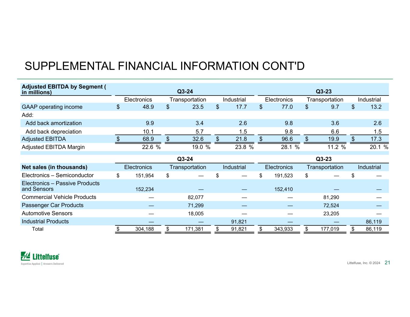 20Littelfuse, Inc. © 2024 SUPPLEMENTAL FINANCIAL INFORMATION CONT'D Adjusted operating margin / Adjusted EBITDA reconciliation (in millions) YTD-23YTD-24Q3-23Q3-24 $ 216.6$ 152.0$ 57.8$ 58.1Net income Add: 53.042.617.519.7Income taxes 29.829.410.19.8Interest expense 8.74.311.89.6Foreign exchange loss (11.8)(19.9)(3.5)(9.3)Other income, net $ 296.3$ 208.3$ 93.6$ 87.8GAAP operating income 22.211.66.32.3Non-GAAP adjustments to operating income $ 318.5$ 219.9$ 99.9$ 90.1Adjusted operating income 49.847.416.015.9Amortization of intangibles 53.551.017.917.3Depreciation expense $ 421.8$ 318.3$ 133.8$ 123.3Adjusted EBITDA $ 1,828.9$ 1,661.3$ 607.1$ 567.4Net sales 11.8 %9.1 %9.5 %10.2 %Net income as a percentage of net sales 16.2 %12.5 %15.4 %15.5 %Operating margin 17.4 %13.2 %16.5 %15.9 %Adjusted operating margin 23.1 %19.2 %22.0 %21.7 %Adjusted EBITDA margin