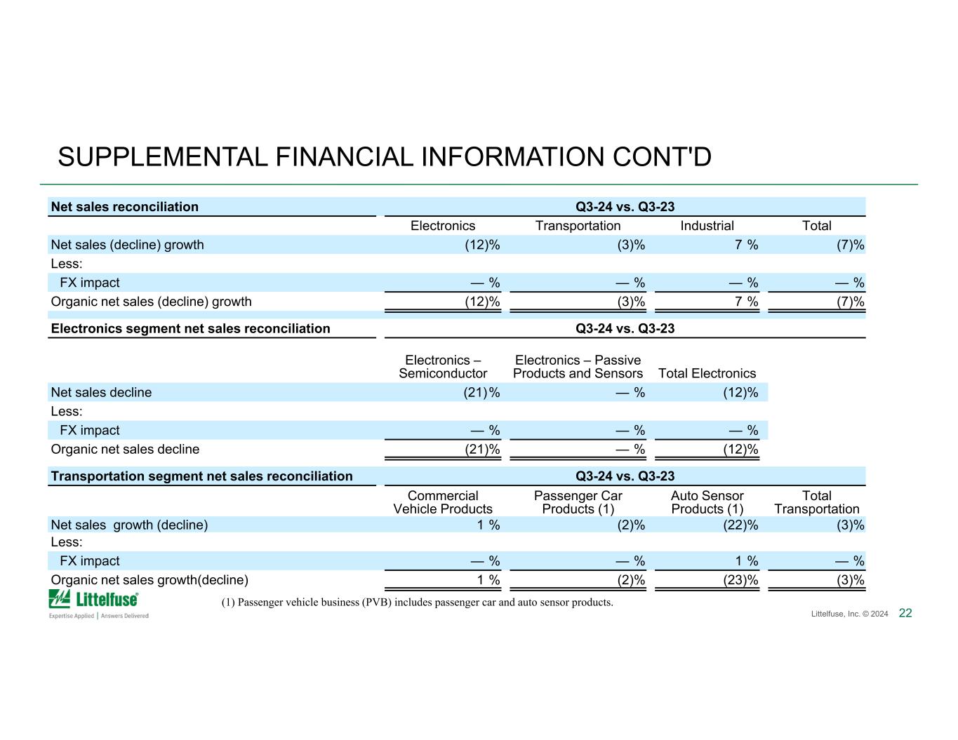 22Littelfuse, Inc. © 2024 SUPPLEMENTAL FINANCIAL INFORMATION CONT'D Q3-24 vs. Q3-23Net sales reconciliation TotalIndustrialTransportationElectronics (7)%7 %(3)%(12)%Net sales (decline) growth Less: — %— %— %— %FX impact (7)%7 %(3)%(12)%Organic net sales (decline) growth Q3-24 vs. Q3-23Electronics segment net sales reconciliation Total Electronics Electronics – Passive Products and Sensors Electronics – Semiconductor (12)%— %(21)%Net sales decline Less: — %— %— %FX impact (12)%— %(21)%Organic net sales decline Q3-24 vs. Q3-23Transportation segment net sales reconciliation Total Transportation Auto Sensor Products (1) Passenger Car Products (1) Commercial Vehicle Products (3)%(22)%(2)%1 %Net sales growth (decline) Less: — %1 %— %— %FX impact (3)%(23)%(2)%1 %Organic net sales growth(decline) (1) Passenger vehicle business (PVB) includes passenger car and auto sensor products.