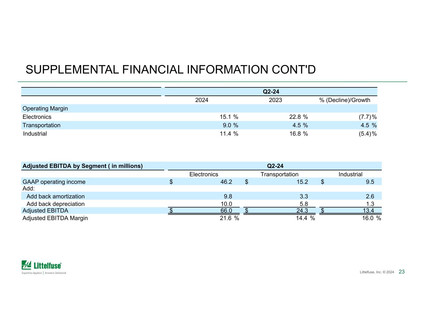 23Littelfuse, Inc. © 2024 SUPPLEMENTAL FINANCIAL INFORMATION CONT'D Q2-24 % (Decline)/Growth20232024 Operating Margin (7.7)%22.8 %15.1 %Electronics 4.5 %4.5 %9.0 %Transportation (5.4)%16.8 %11.4 %Industrial Q2-24Adjusted EBITDA by Segment ( in millions) IndustrialTransportationElectronics $ 9.5$ 15.2$ 46.2GAAP operating income Add: 2.63.39.8Add back amortization 1.35.810.0Add back depreciation $ 13.4$ 24.3$ 66.0Adjusted EBITDA 16.0 %14.4 %21.6 %Adjusted EBITDA Margin