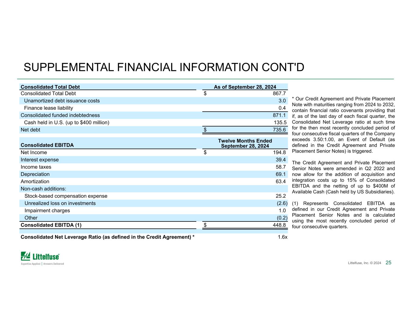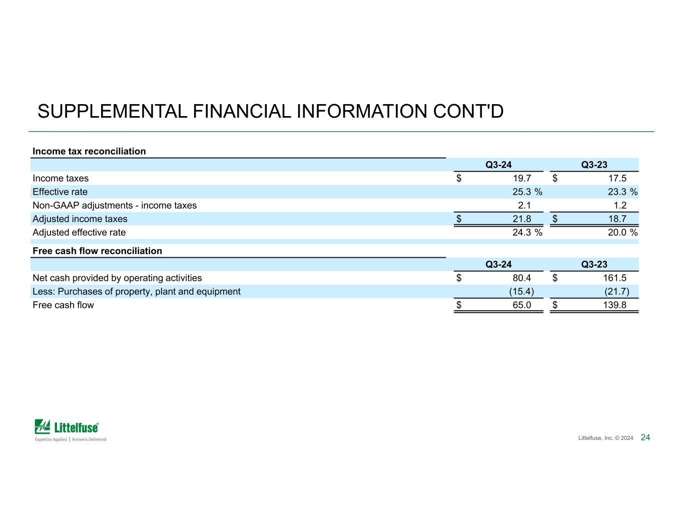 24Littelfuse, Inc. © 2024 SUPPLEMENTAL FINANCIAL INFORMATION CONT'D Income tax reconciliation Q3-23Q3-24 $ 17.5$ 19.7Income taxes 23.3 %25.3 %Effective rate 1.22.1Non-GAAP adjustments - income taxes $ 18.7$ 21.8Adjusted income taxes 20.0 %24.3 %Adjusted effective rate Free cash flow reconciliation Q3-23Q3-24 $ 161.5$ 80.4Net cash provided by operating activities (21.7)(15.4)Less: Purchases of property, plant and equipment $ 139.8$ 65.0Free cash flow