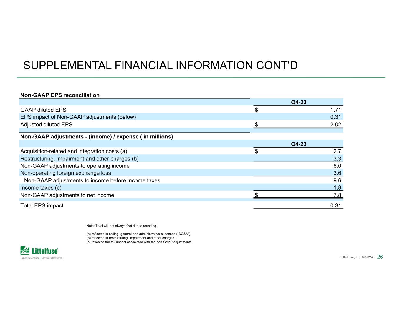 26Littelfuse, Inc. © 2024 SUPPLEMENTAL FINANCIAL INFORMATION CONT'D Non-GAAP EPS reconciliation Q4-23 $ 1.71GAAP diluted EPS 0.31EPS impact of Non-GAAP adjustments (below) $ 2.02Adjusted diluted EPS Non-GAAP adjustments - (income) / expense ( in millions) Q4-23 $ 2.7Acquisition-related and integration costs (a) 3.3Restructuring, impairment and other charges (b) 6.0Non-GAAP adjustments to operating income 3.6Non-operating foreign exchange loss 9.6Non-GAAP adjustments to income before income taxes 1.8Income taxes (c) $ 7.8Non-GAAP adjustments to net income 0.31Total EPS impact Note: Total will not always foot due to rounding. (a) reflected in selling, general and administrative expenses ("SG&A"). (b) reflected in restructuring, impairment and other charges. (c) reflected the tax impact associated with the non-GAAP adjustments.