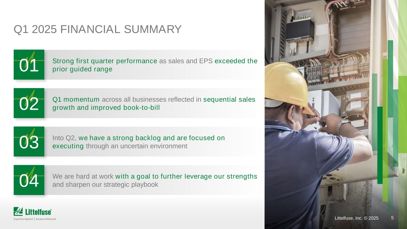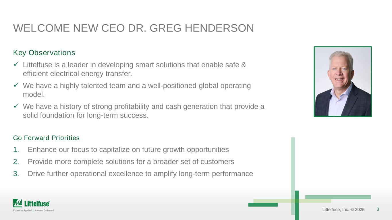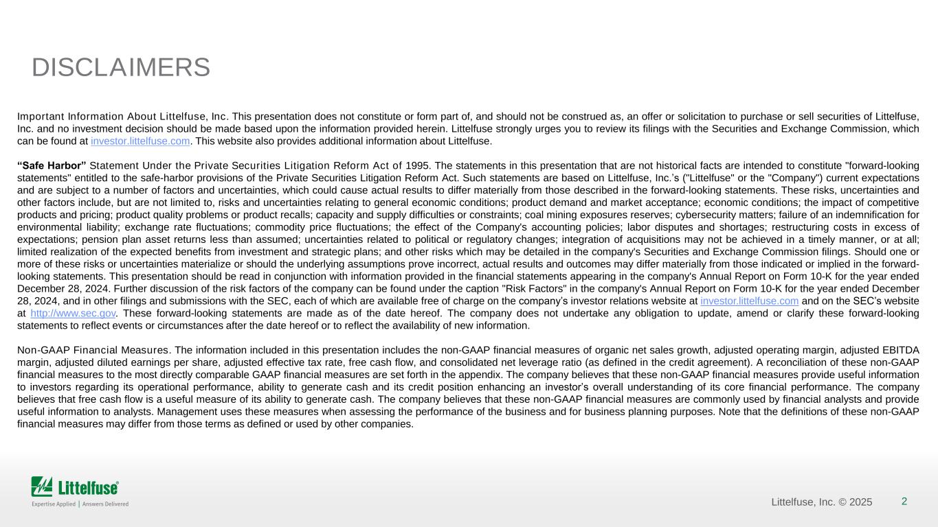 2Littelfuse, Inc. © 2025 DISCLAIMERS Important Information About Littelfuse, Inc. This presentation does not constitute or form part of, and should not be construed as, an offer or solicitation to purchase or sell securities of Littelfuse, Inc. and no investment decision should be made based upon the information provided herein. Littelfuse strongly urges you to review its filings with the Securities and Exchange Commission, which can be found at investor.littelfuse.com. This website also provides additional information about Littelfuse. “Safe Harbor” Statement Under the Private Securities Litigation Reform Act of 1995. The statements in this presentation that are not historical facts are intended to constitute "forward-looking statements" entitled to the safe-harbor provisions of the Private Securities Litigation Reform Act. Such statements are based on Littelfuse, Inc.’s ("Littelfuse" or the "Company") current expectations and are subject to a number of factors and uncertainties, which could cause actual results to differ materially from those described in the forward-looking statements. These risks, uncertainties and other factors include, but are not limited to, risks and uncertainties relating to general economic conditions; product demand and market acceptance; economic conditions; the impact of competitive products and pricing; product quality problems or product recalls; capacity and supply difficulties or constraints; coal mining exposures reserves; cybersecurity matters; failure of an indemnification for environmental liability; exchange rate fluctuations; commodity price fluctuations; the effect of the Company's accounting policies; labor disputes and shortages; restructuring costs in excess of expectations; pension plan asset returns less than assumed; uncertainties related to political or regulatory changes; integration of acquisitions may not be achieved in a timely manner, or at all; limited realization of the expected benefits from investment and strategic plans; and other risks which may be detailed in the company's Securities and Exchange Commission filings. Should one or more of these risks or uncertainties materialize or should the underlying assumptions prove incorrect, actual results and outcomes may differ materially from those indicated or implied in the forward- looking statements. This presentation should be read in conjunction with information provided in the financial statements appearing in the company's Annual Report on Form 10-K for the year ended December 28, 2024. Further discussion of the risk factors of the company can be found under the caption "Risk Factors" in the company's Annual Report on Form 10-K for the year ended December 28, 2024, and in other filings and submissions with the SEC, each of which are available free of charge on the company’s investor relations website at investor.littelfuse.com and on the SEC’s website at http://www.sec.gov. These forward-looking statements are made as of the date hereof. The company does not undertake any obligation to update, amend or clarify these forward-looking statements to reflect events or circumstances after the date hereof or to reflect the availability of new information. Non-GAAP Financial Measures. The information included in this presentation includes the non-GAAP financial measures of organic net sales growth, adjusted operating margin, adjusted EBITDA margin, adjusted diluted earnings per share, adjusted effective tax rate, free cash flow, and consolidated net leverage ratio (as defined in the credit agreement). A reconciliation of these non-GAAP financial measures to the most directly comparable GAAP financial measures are set forth in the appendix. The company believes that these non-GAAP financial measures provide useful information to investors regarding its operational performance, ability to generate cash and its credit position enhancing an investor’s overall understanding of its core financial performance. The company believes that free cash flow is a useful measure of its ability to generate cash. The company believes that these non-GAAP financial measures are commonly used by financial analysts and provide useful information to analysts. Management uses these measures when assessing the performance of the business and for business planning purposes. Note that the definitions of these non-GAAP financial measures may differ from those terms as defined or used by other companies.