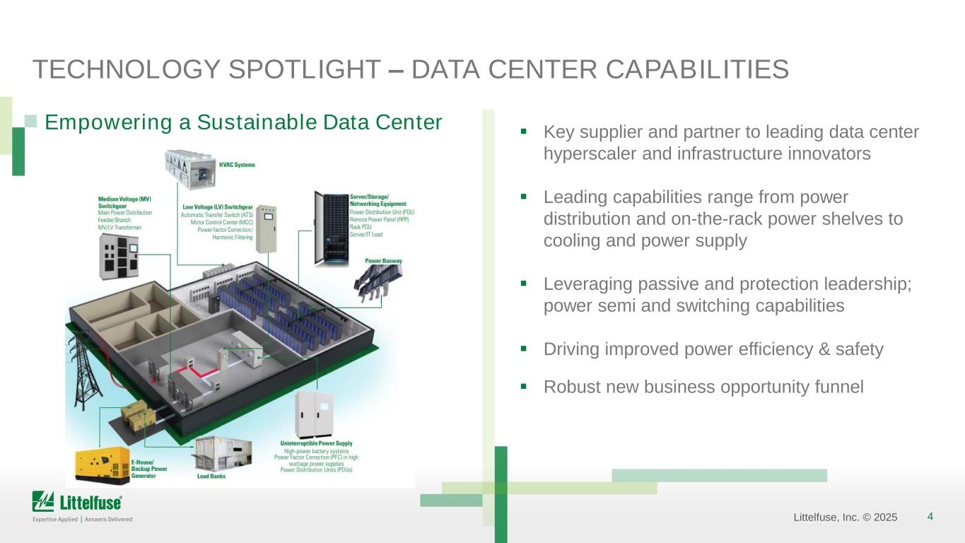 3Littelfuse, Inc. © 2025 WELCOME NEW CEO DR. GREG HENDERSON Key Observations ✓ Littelfuse is a leader in developing smart solutions that enable safe & efficient electrical energy transfer. ✓ We have a highly talented team and a well-positioned global operating model. ✓ We have a history of strong profitability and cash generation that provide a solid foundation for long-term success. Go Forward Priorities 1. Enhance our focus to capitalize on future growth opportunities 2. Provide more complete solutions for a broader set of customers 3. Drive further operational excellence to amplify long-term performance