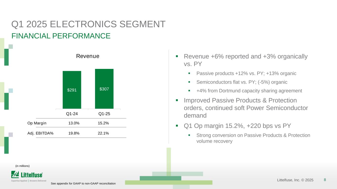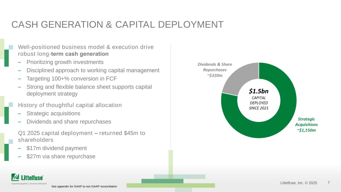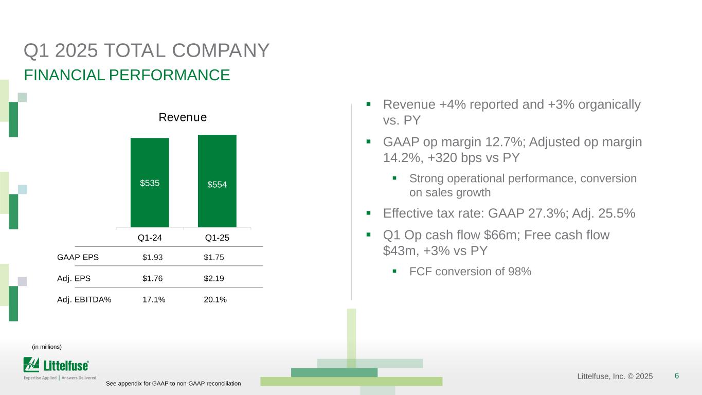 6Littelfuse, Inc. © 2025 Q1 2025 TOTAL COMPANY ▪ Revenue +4% reported and +3% organically vs. PY ▪ GAAP op margin 12.7%; Adjusted op margin 14.2%, +320 bps vs PY ▪ Strong operational performance, conversion on sales growth ▪ Effective tax rate: GAAP 27.3%; Adj. 25.5% ▪ Q1 Op cash flow $66m; Free cash flow $43m, +3% vs PY ▪ FCF conversion of 98% FINANCIAL PERFORMANCE GAAP EPS $1.93 $1.75 Adj. EPS $1.76 $2.19 Adj. EBITDA% 17.1% 20.1% $535 $554 Q1-24 Q1-25 Revenue (in millions) See appendix for GAAP to non-GAAP reconciliation