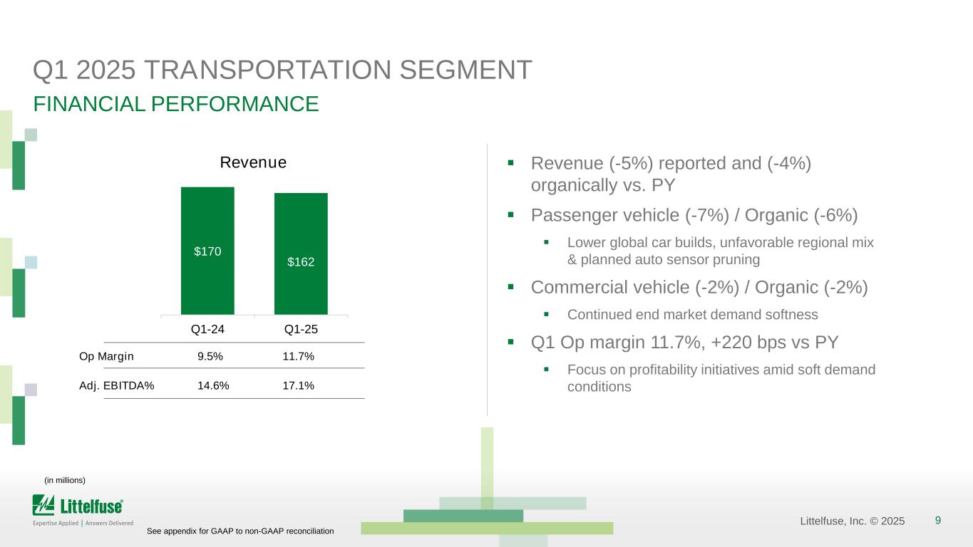 8Littelfuse, Inc. © 2025 Q1 2025 ELECTRONICS SEGMENT ▪ Revenue +6% reported and +3% organically vs. PY ▪ Passive products +12% vs. PY; +13% organic ▪ Semiconductors flat vs. PY; (-5%) organic ▪ +4% from Dortmund capacity sharing agreement ▪ Improved Passive Products & Protection orders, continued soft Power Semiconductor demand ▪ Q1 Op margin 15.2%, +220 bps vs PY ▪ Strong conversion on Passive Products & Protection volume recovery FINANCIAL PERFORMANCE Op Margin 13.0% 15.2% Adj. EBITDA% 19.8% 22.1% $291 $307 Q1-24 Q1-25 Revenue (in millions) See appendix for GAAP to non-GAAP reconciliation