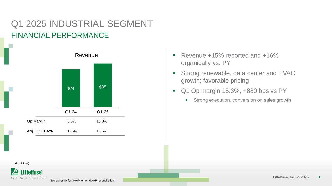 9Littelfuse, Inc. © 2025 Q1 2025 TRANSPORTATION SEGMENT ▪ Revenue (-5%) reported and (-4%) organically vs. PY ▪ Passenger vehicle (-7%) / Organic (-6%) ▪ Lower global car builds, unfavorable regional mix & planned auto sensor pruning ▪ Commercial vehicle (-2%) / Organic (-2%) ▪ Continued end market demand softness ▪ Q1 Op margin 11.7%, +220 bps vs PY ▪ Focus on profitability initiatives amid soft demand conditions FINANCIAL PERFORMANCE Op Margin 9.5% 11.7% Adj. EBITDA% 14.6% 17.1% $170 $162 Q1-24 Q1-25 Revenue (in millions) See appendix for GAAP to non-GAAP reconciliation