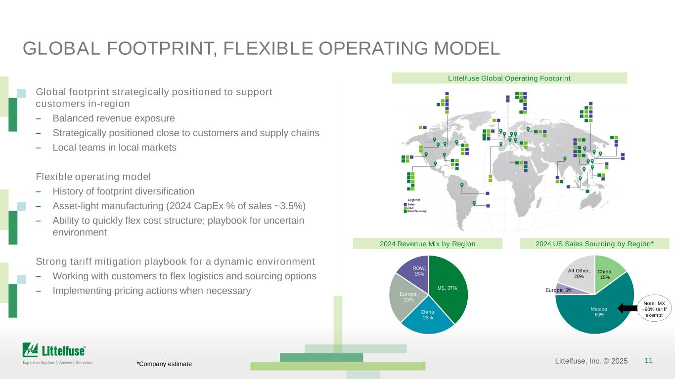 11Littelfuse, Inc. © 2025 GLOBAL FOOTPRINT, FLEXIBLE OPERATING MODEL Global footprint strategically positioned to support customers in-region – Balanced revenue exposure – Strategically positioned close to customers and supply chains – Local teams in local markets Flexible operating model – History of footprint diversification – Asset-light manufacturing (2024 CapEx % of sales ~3.5%) – Ability to quickly flex cost structure; playbook for uncertain environment Strong tariff mitigation playbook for a dynamic environment – Working with customers to flex logistics and sourcing options – Implementing pricing actions when necessary US, 37% China, 23% Europe, 21% ROW, 15% 2024 Revenue Mix by Region China, 15% Mexico, 60% Europe, 5% All Other, 20% 2024 US Sales Sourcing by Region* *Company estimate Note: MX ~90% tariff exempt Littelfuse Global Operating Footprint