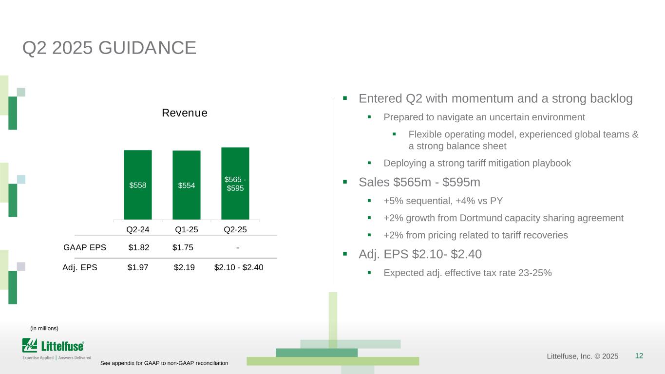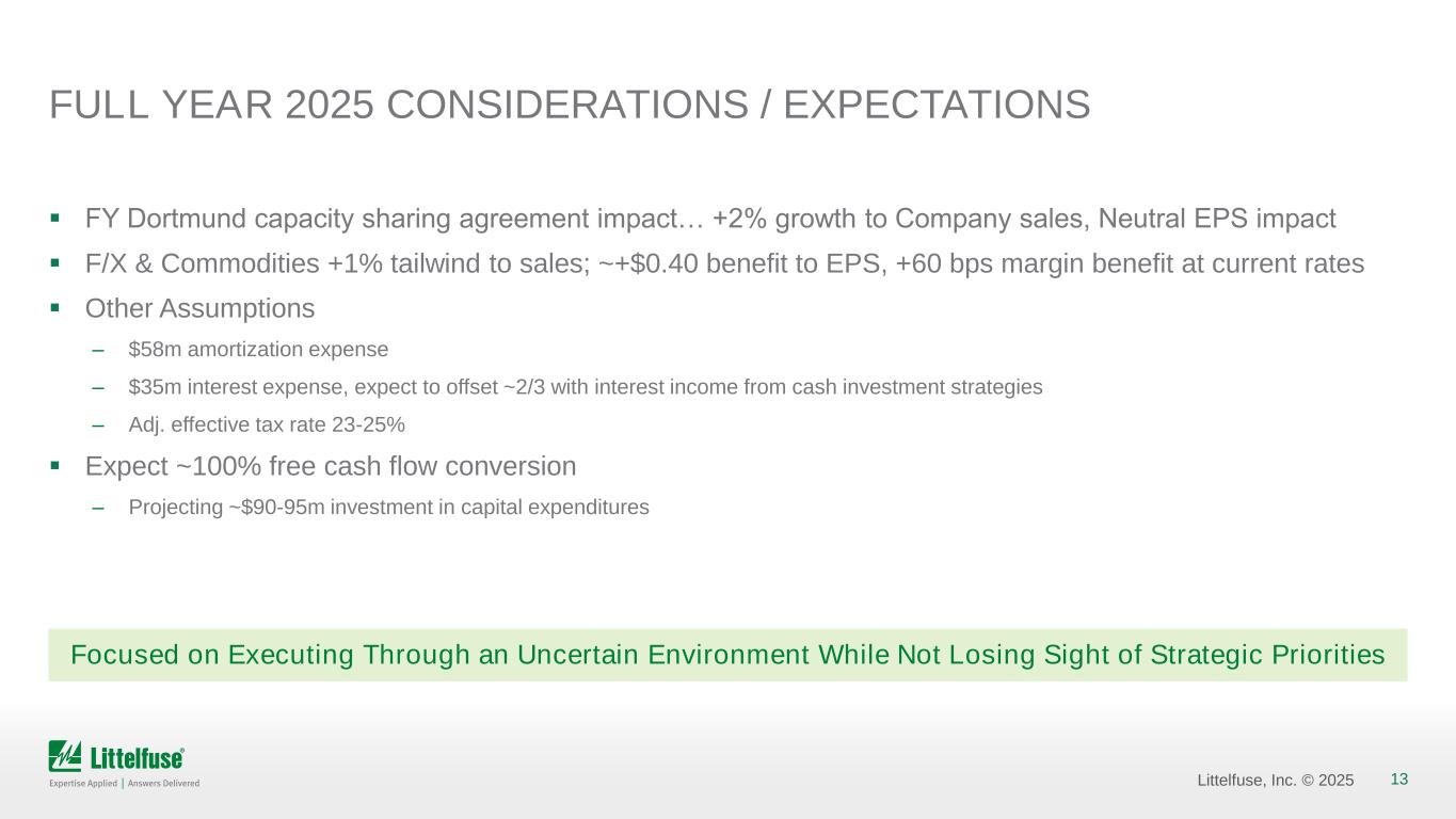 12Littelfuse, Inc. © 2025 Q2 2025 GUIDANCE ▪ Entered Q2 with momentum and a strong backlog ▪ Prepared to navigate an uncertain environment ▪ Flexible operating model, experienced global teams & a strong balance sheet ▪ Deploying a strong tariff mitigation playbook ▪ Sales $565m - $595m ▪ +5% sequential, +4% vs PY ▪ +2% growth from Dortmund capacity sharing agreement ▪ +2% from pricing related to tariff recoveries ▪ Adj. EPS $2.10- $2.40 ▪ Expected adj. effective tax rate 23-25% (in millions) $558 $554 $565 - $595 Q2-24 Q1-25 Q2-25 Revenue Adj. EPS $1.97 $2.19 $2.10 - $2.40 GAAP EPS $1.82 $1.75 - See appendix for GAAP to non-GAAP reconciliation